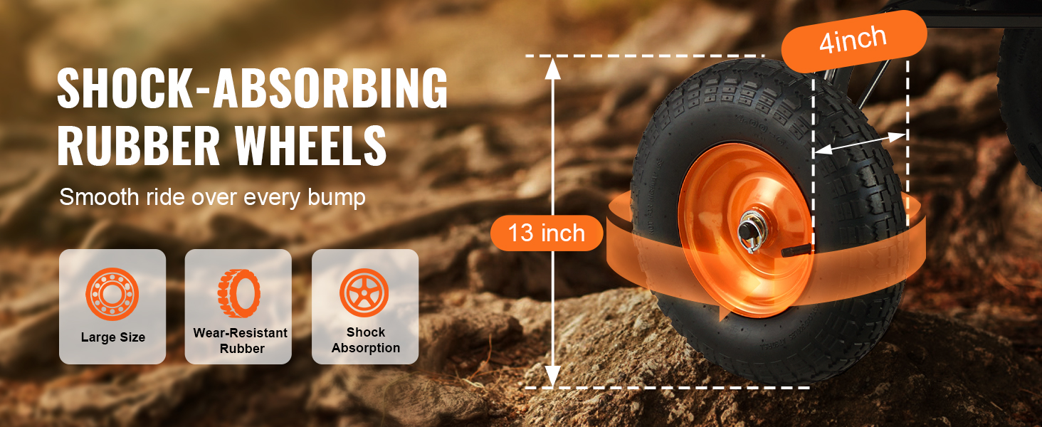 Tento zahradní vozík je vybaven velkými 13" gumovými koly, která zajišťují vynikající odolnost a tlumení nárazů a zajišťují hladký pohyb i na nerovném terénu. Díky 360° otočným kolům je otáčení bezproblémové a přeprava je tak hračkou.