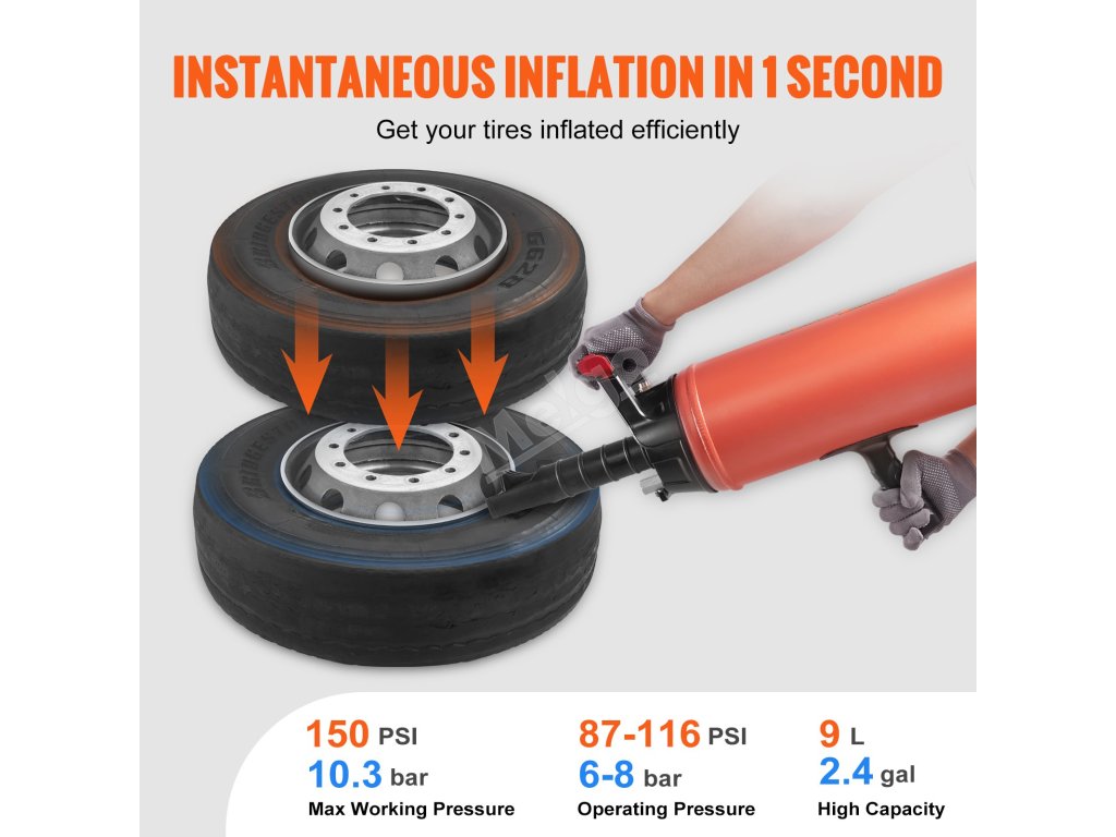 Sedlo pneumatiky má velký objem 9 l/2,4 galonu a maximální tlak 150 psi/10,3 baru. Umožňuje nastavit tlak pro optimální výkon u různých pneumatik. Naše sedátko na pneumatiky je vybaveno vysokotlakým rychlospojkou, která zajišťuje spolehlivé huštění pneumatik.