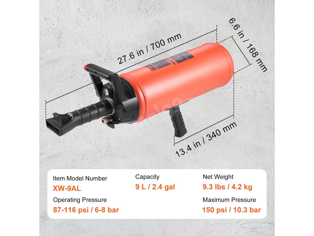 Vypalovač pneumatik ruční 9 l, 150 psi, provozní tlak 87–116 psi