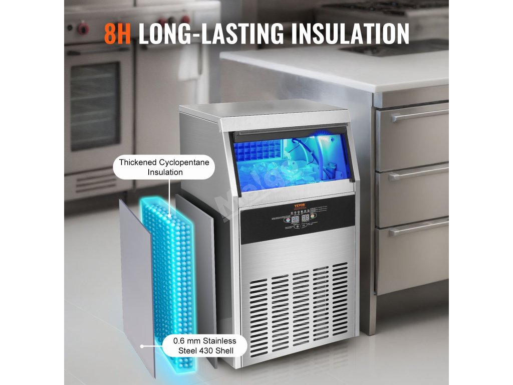 Náš výrobník ledu má integrovanou konstrukci, která usnadňuje instalaci. Účinně izoluje vnější teplo pomocí zesíleného cyklopentanového izolačního materiálu a vnějšího krytu z nerezové oceli. I když se nepoužívá, mohou vaše kostky ledu zůstat zmražené po dobu 6 až 8 hodin.