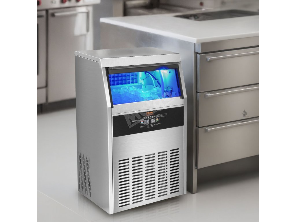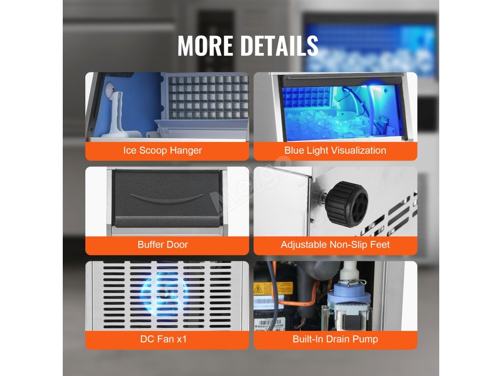 Náš komerční výrobník ledu je vybaven 50 kostkami ledu, které umožňují nastavit tloušťku ledu prodloužením nebo zkrácením doby výroby ledu. Díky výkonnému kompresoru dokáže tento výrobník ledu vyrobit kostky ledu již za 12 až 15 minut.