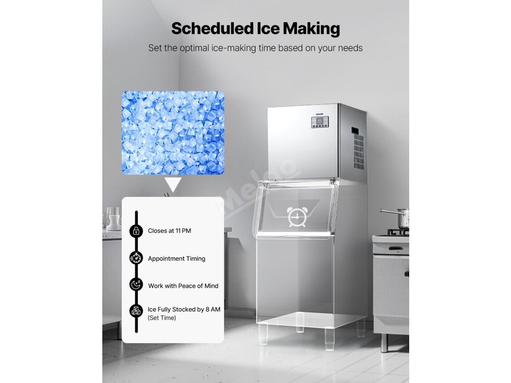 Výrobník kostek ledu poskytuje velký výkon, takže je ideální pro komerční kuchyně, restaurace, bary, hotely a prodejny nápojů.