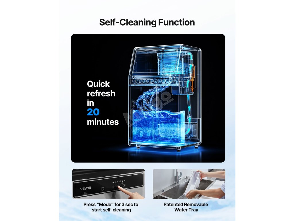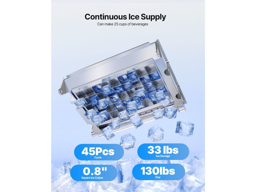 Komerční výrobník ledu vyrobí až 130 kilogramů čtvercového ledu za 24 hodin, přičemž 33 kilogramů lze uskladnit. Díky certifikaci ENERGY STAR a ETL zaručuje bezpečný a energeticky účinný výkon. Je vybaven funkcí automatického čištění a časovačem pro snadné každodenní používání, ideální pro domácí použití nebo lehké komerční potřeby.