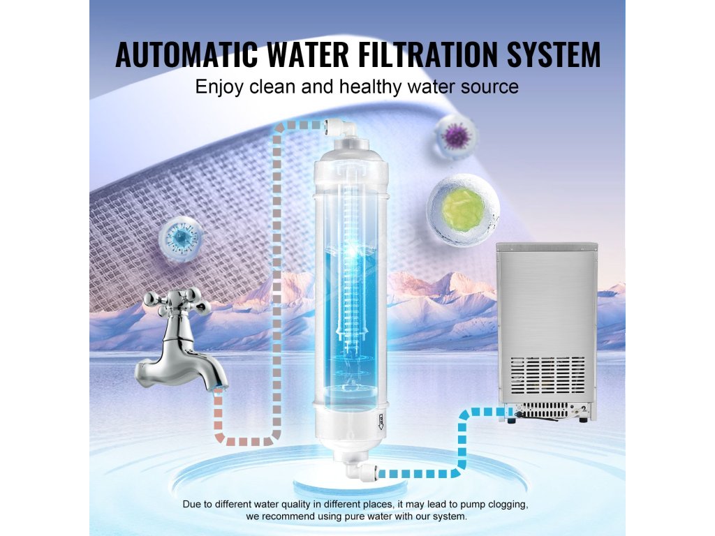 Náš komerční výrobník ledu je vybaven praktickou funkcí samočištění jedním dotykem, která zajistí, že výrobník ledu zůstane čistý. Kromě toho obsahuje filtr pro přívodní trubku vody, který účinně filtruje nečistoty z vody a zajišťuje čistou vodu pro výrobu ledu.
