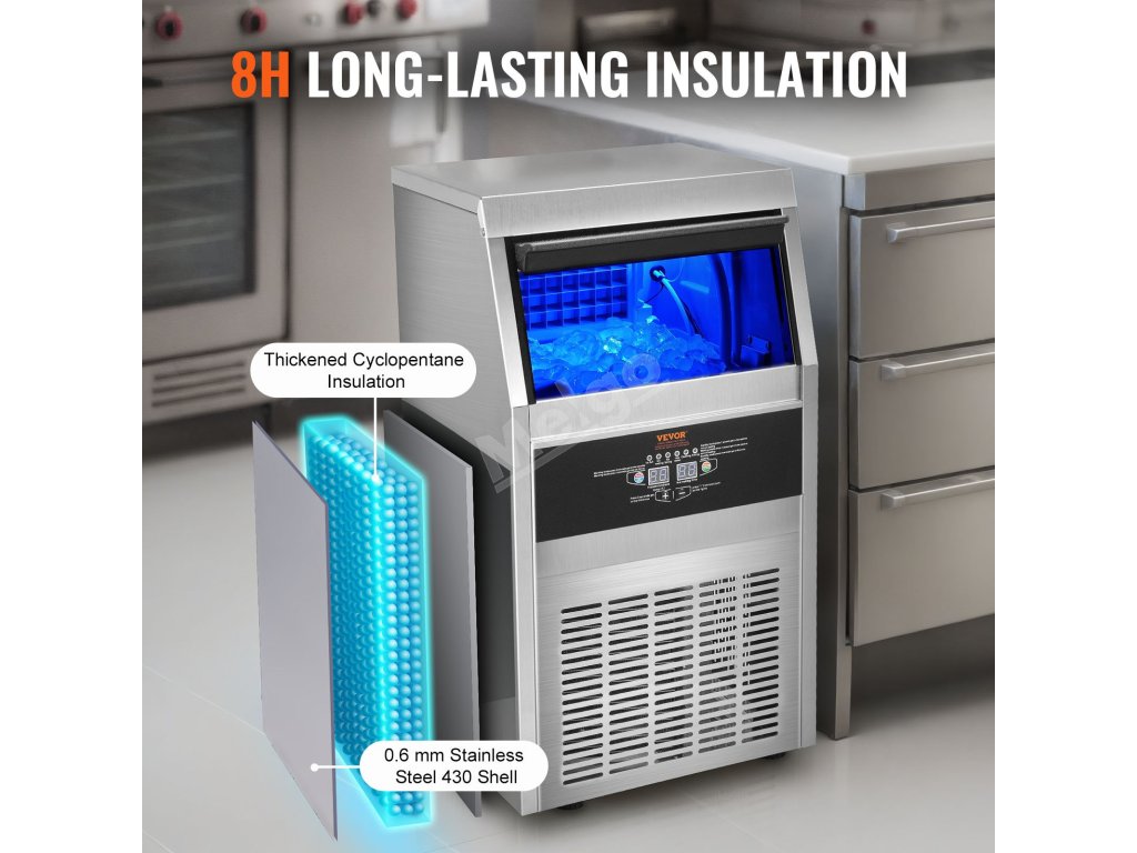 Náš výrobník ledu má integrovanou konstrukci, díky které je instalace snadná. Účinně izoluje vnější teplo pomocí zesílené vrstvy pěnového polystyrenu a vnějšího pláště z nerezové oceli. I když se nepoužívá, mohou vaše kostky ledu zůstat zmražené po dobu 6-8 hodin.