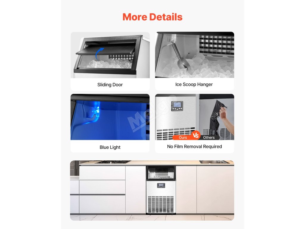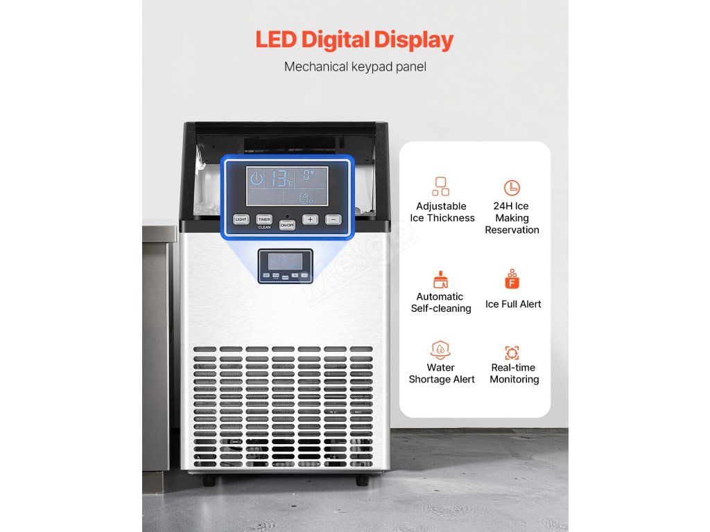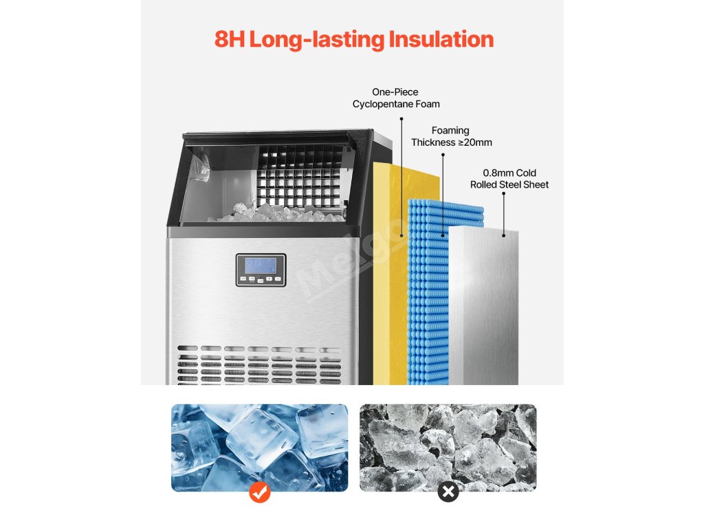Náš komerční výrobník ledu vyrobí 130 kilogramů kostek ledu denně a díky funkci 8hodinové izolace můžete mít kostky ledu kdykoli budete chtít.