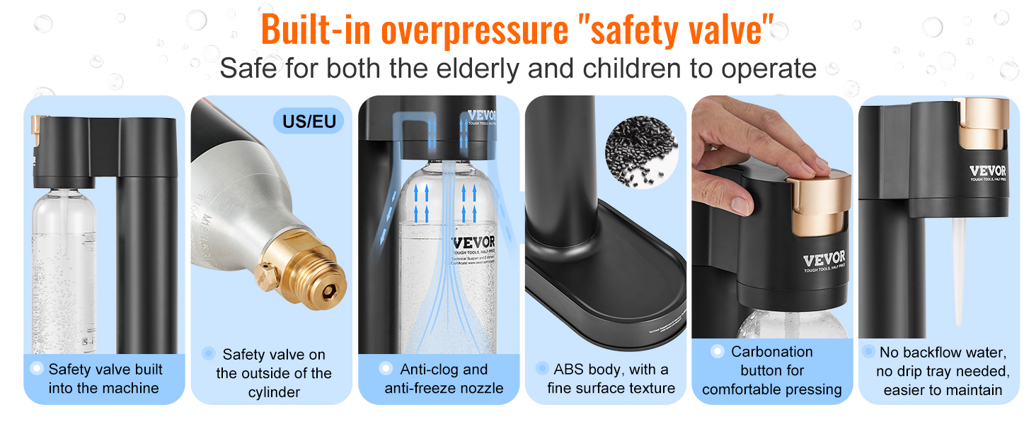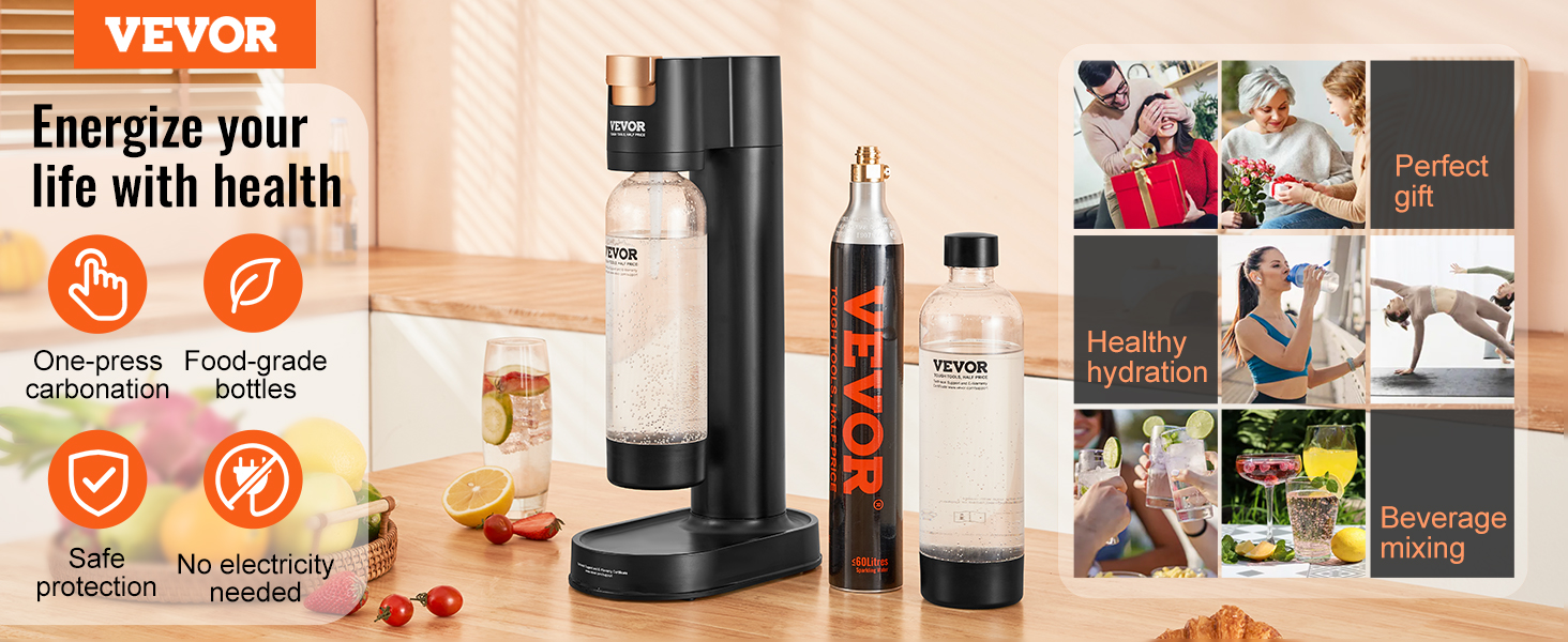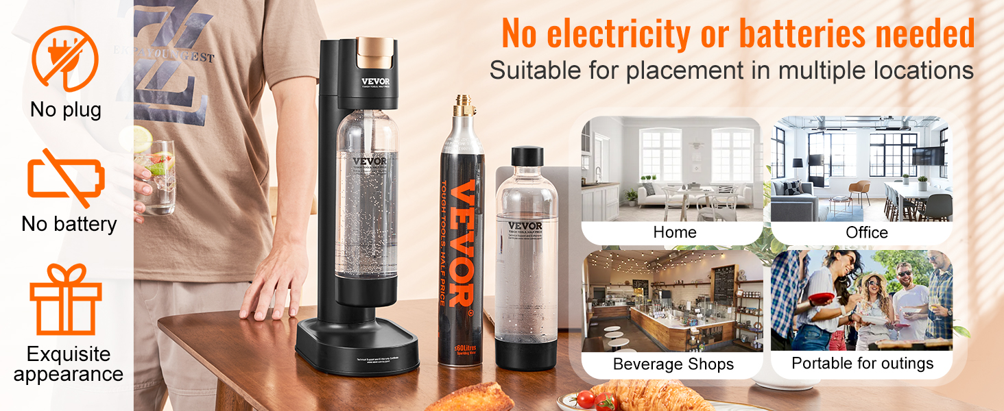 Vychutnejte si sklenici sodové vody během únavného pracovního dne a dopřejte si chutný, zdravý a osvěžující zážitek, aniž byste poškodili své zdraví. Neelektrické provedení se bez problémů integruje do domácností/kanceláří/výčepů nebo na přenosné cesty a zajistí, že vás bude provázet štěstí.