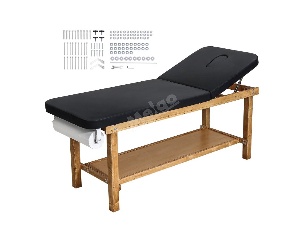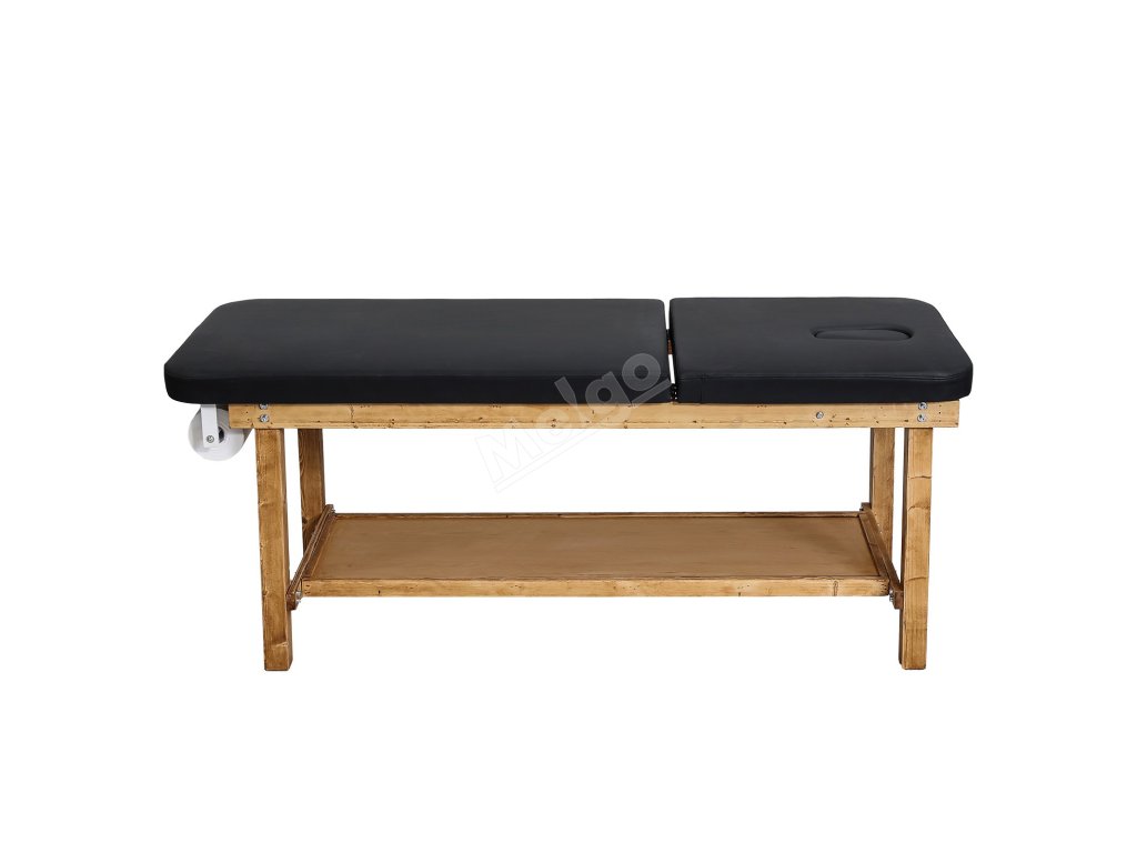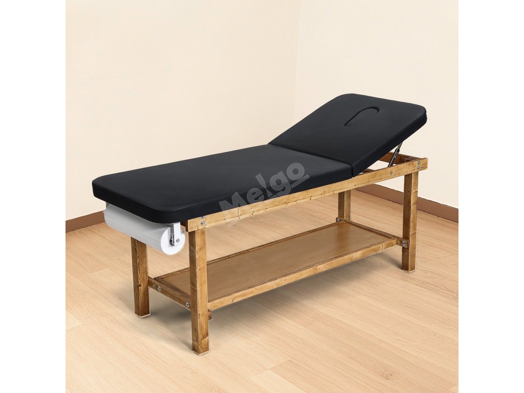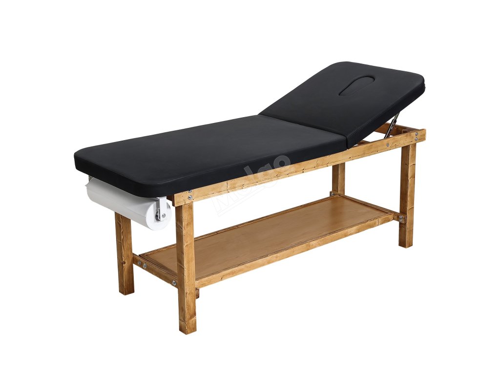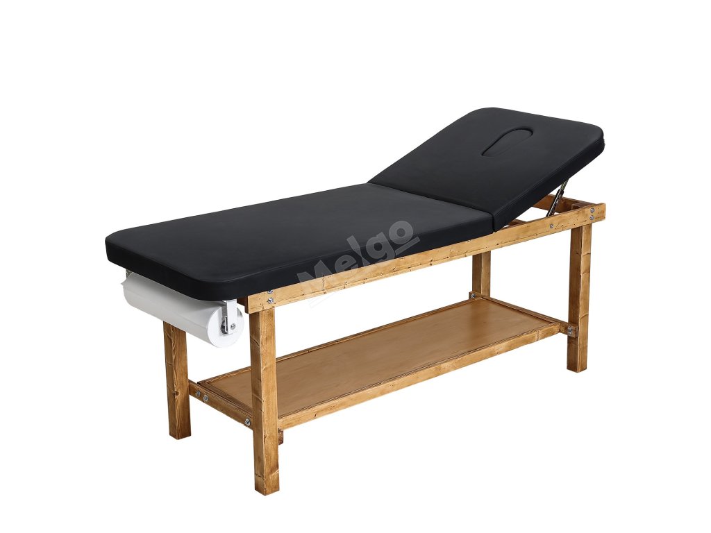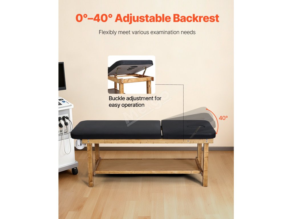 Vyšetřovací stůl s dřevěným rámem, nastavitelné opěradlo a police
