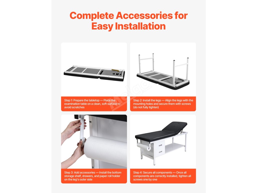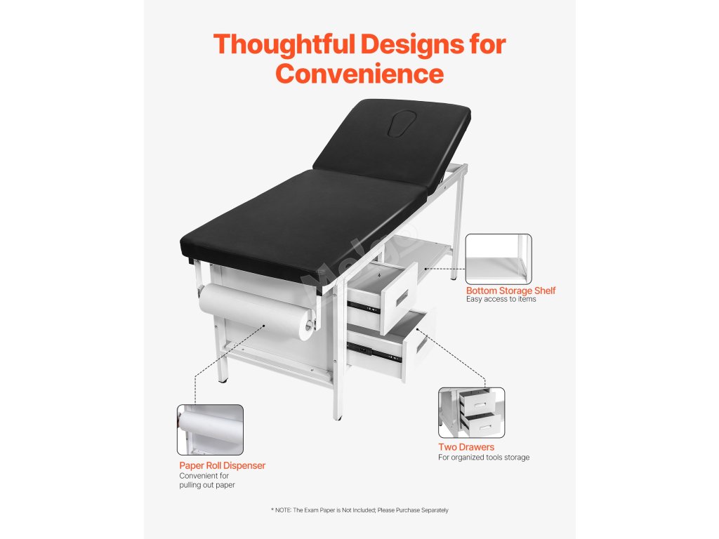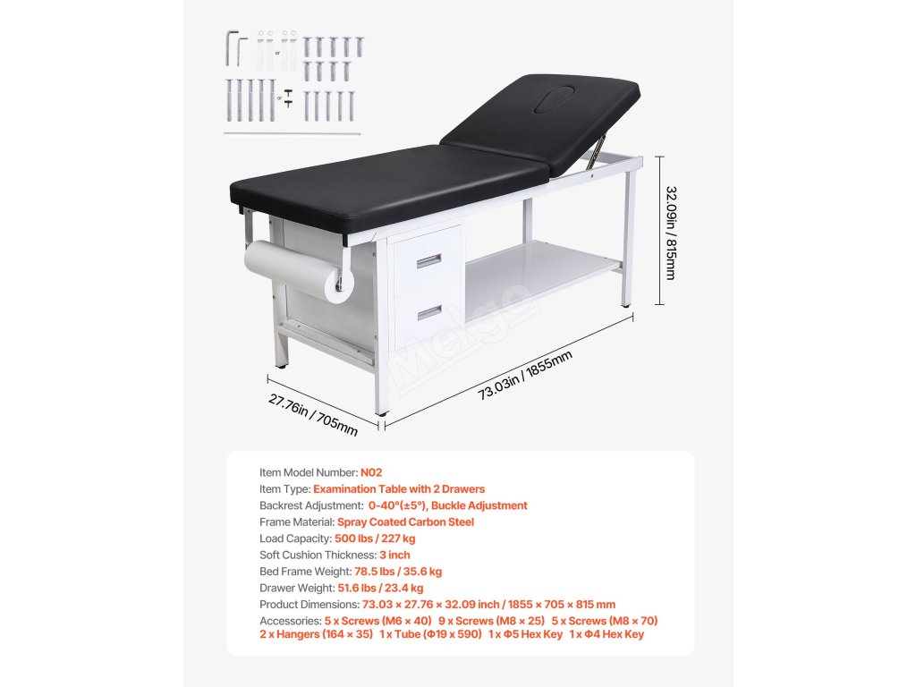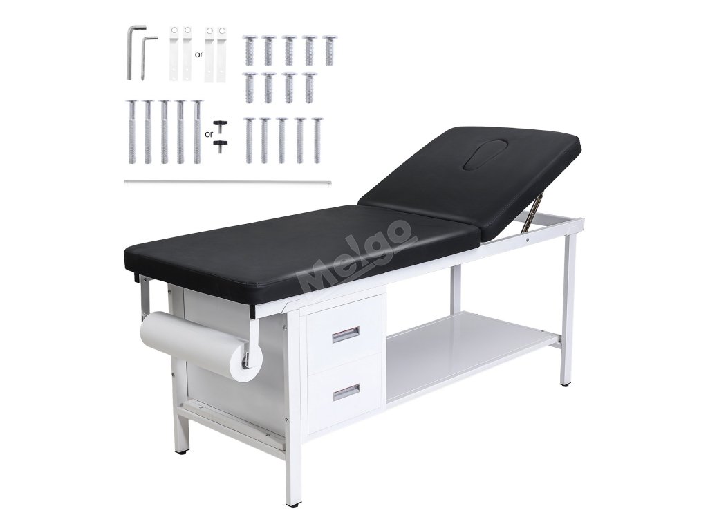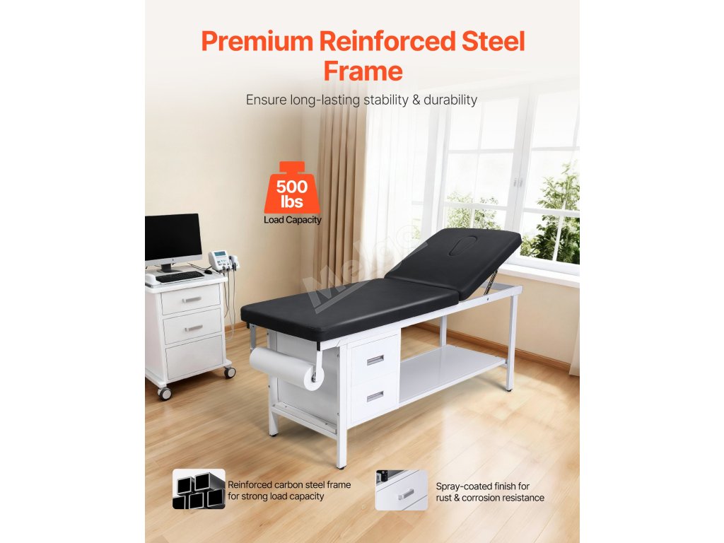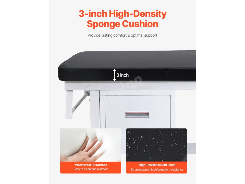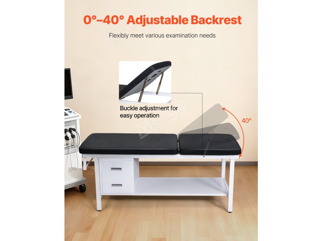 Tento lékařský vyšetřovací stůl má zesílený ocelový rám, 3palcový polštář z pěny s vysokou hustotou a opěradlo nastavitelné v rozsahu 0°-40° pro optimální oporu. Velké pohodlí zajišťují 2 zásuvky, spodní odkládací polička a držák na role papíru, takže je ideální pro kliniky, rehabilitační centra a kosmetická studia.