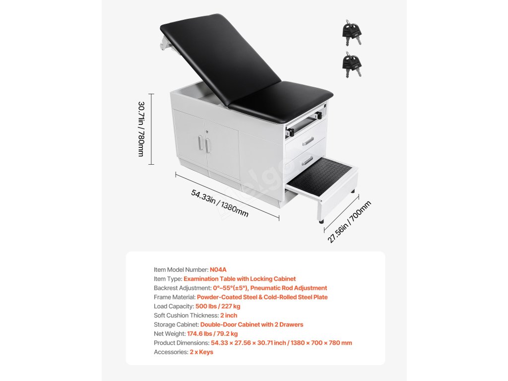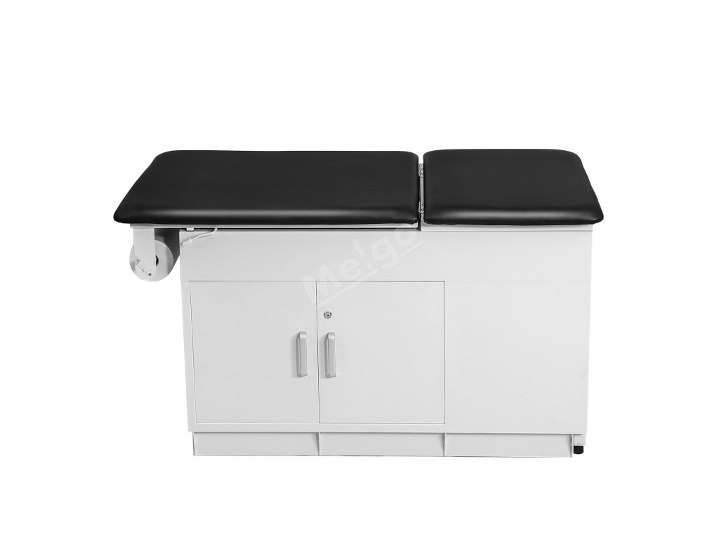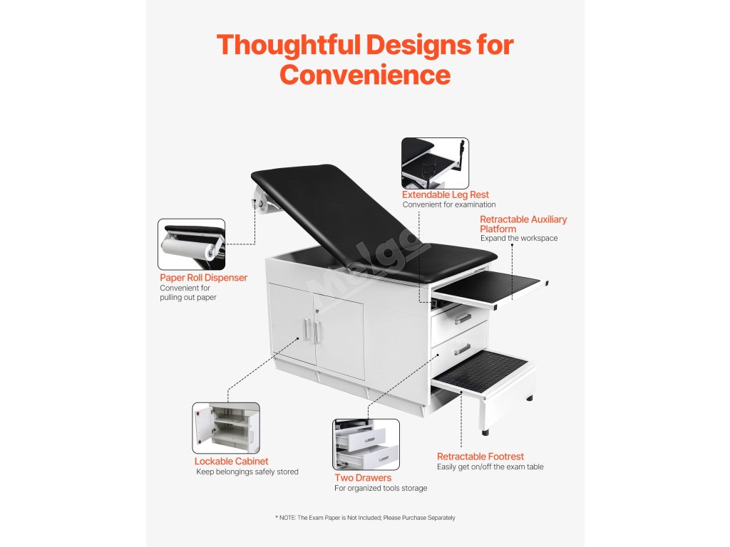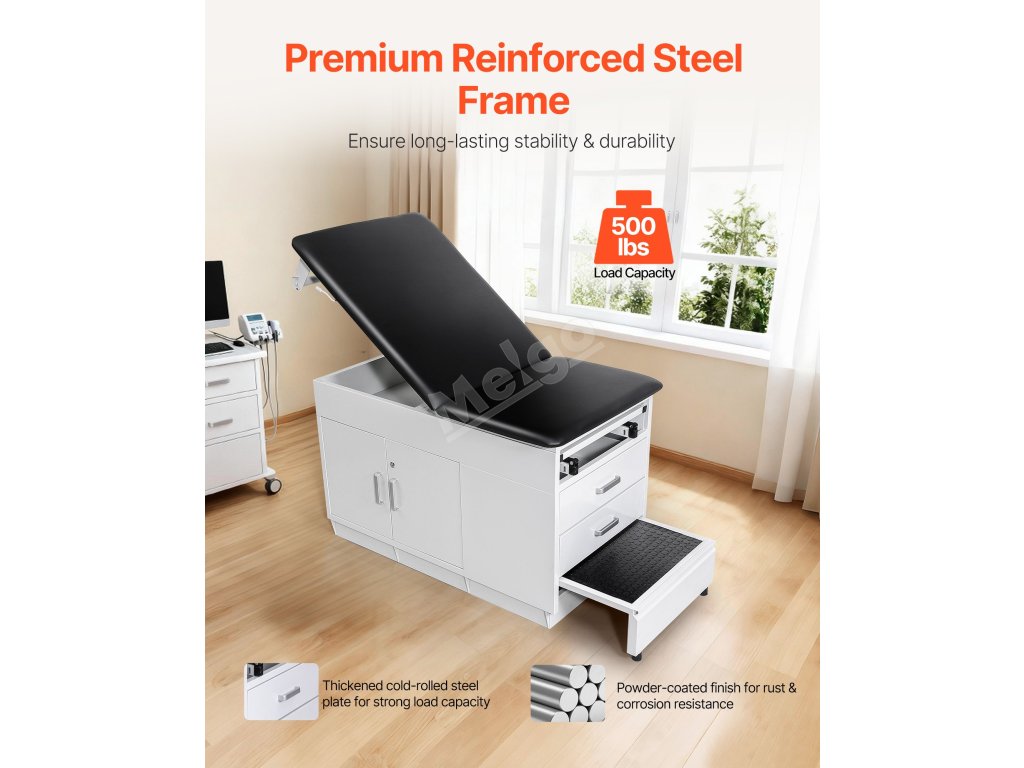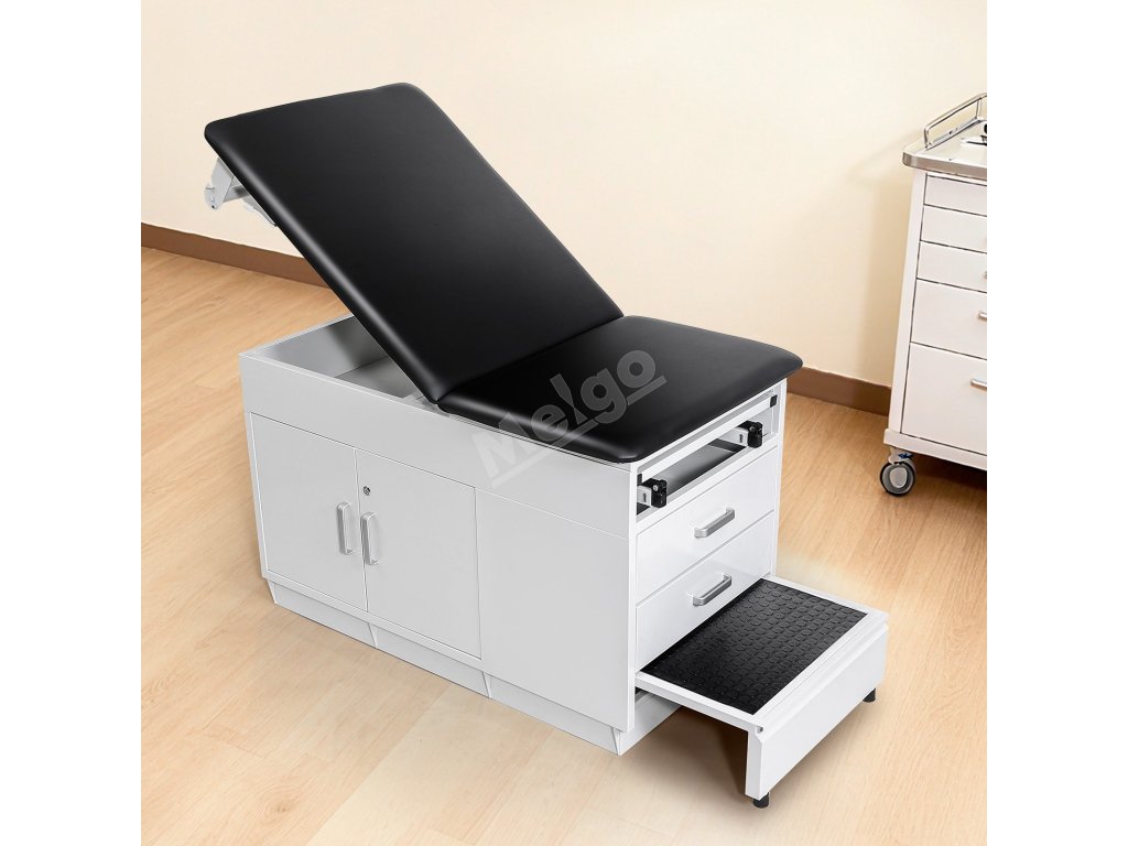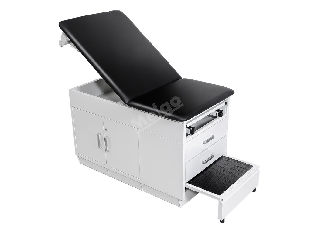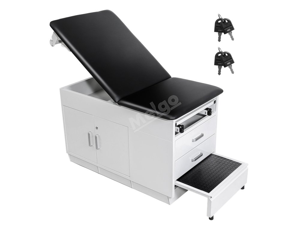 Tento lékařský vyšetřovací stůl má zesílený ocelový rám, pěnový polštář s vysokou hustotou a nastavitelnou opěrku zad pro optimální oporu. Uzamykatelná skříňka, 2 zásuvky, držák na role papíru, stupátko a opěrka nohou mu dodávají velké pohodlí, takže je ideální pro kliniky, rehabilitační centra a kosmetická studia.
