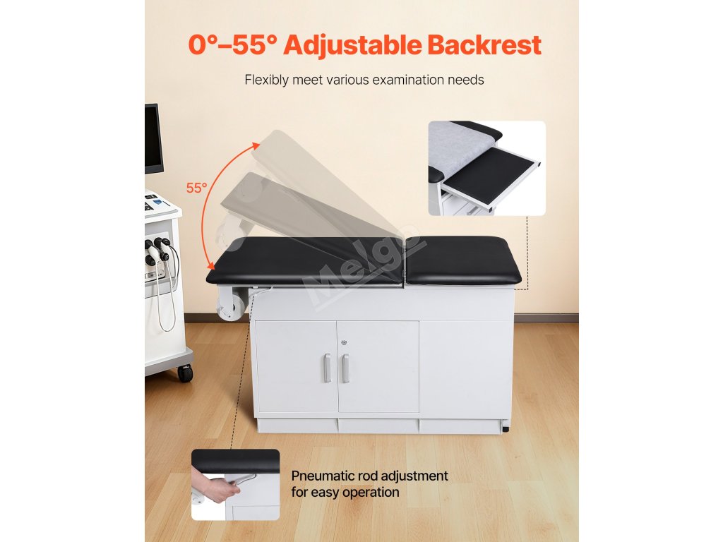 Zádová opěrka se flexibilně nastavuje v rozsahu 0°-55° (±5°), aby vyhovovala různým potřebám vyšetření, což zajišťuje větší pohodlí pro pacienty a vyšší efektivitu pro zdravotnický personál.
