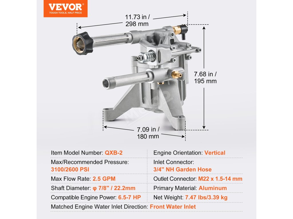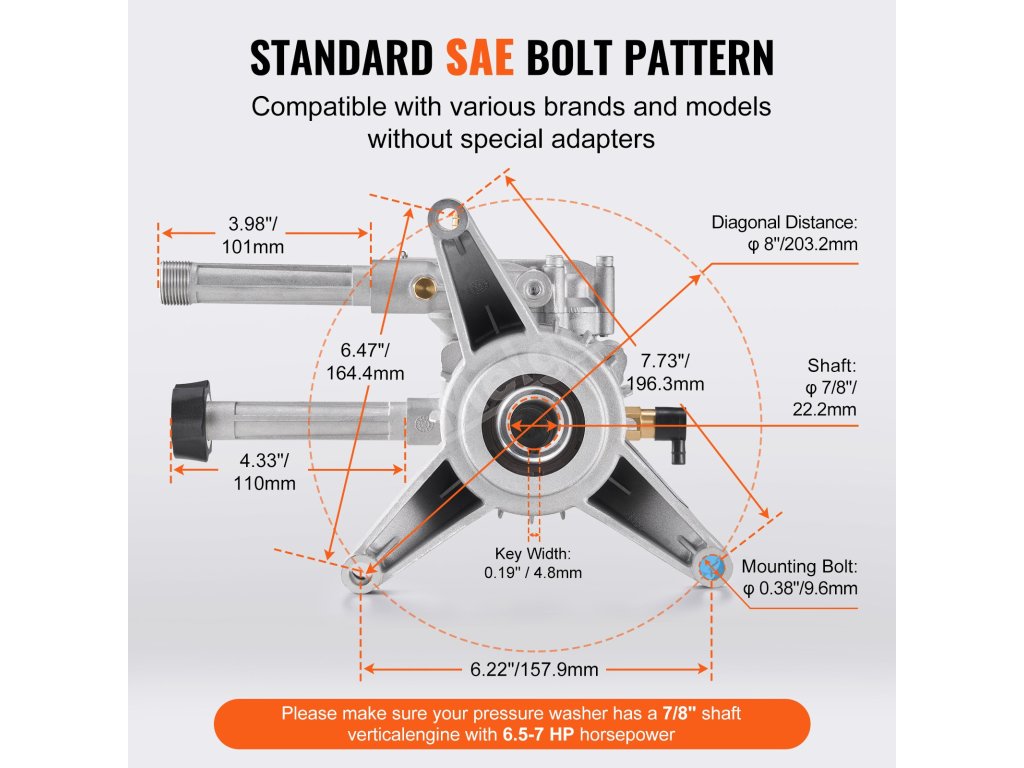 Vodní čerpadlo pro tlakové myčky je kompatibilní s většinou motorů s předním výtlakem o objemu 180-196 cm3 a výkonu 6,5-7 HP, včetně motorů Honda, Troy-Bilt, PowerStroke, Craftsman a mnoha dalších značek.