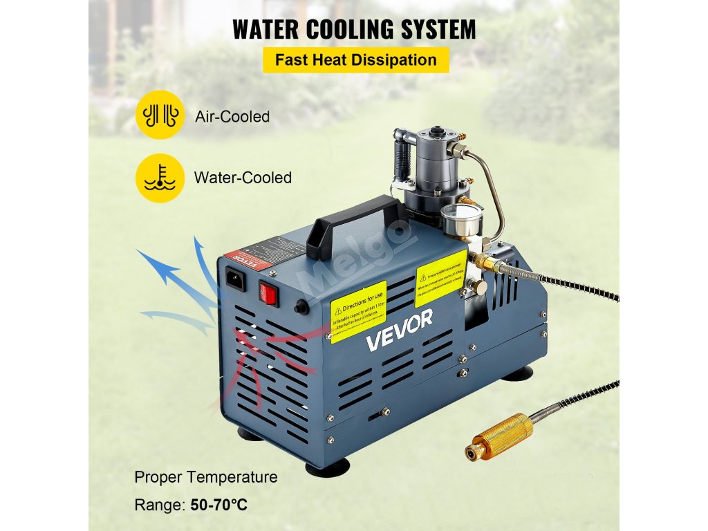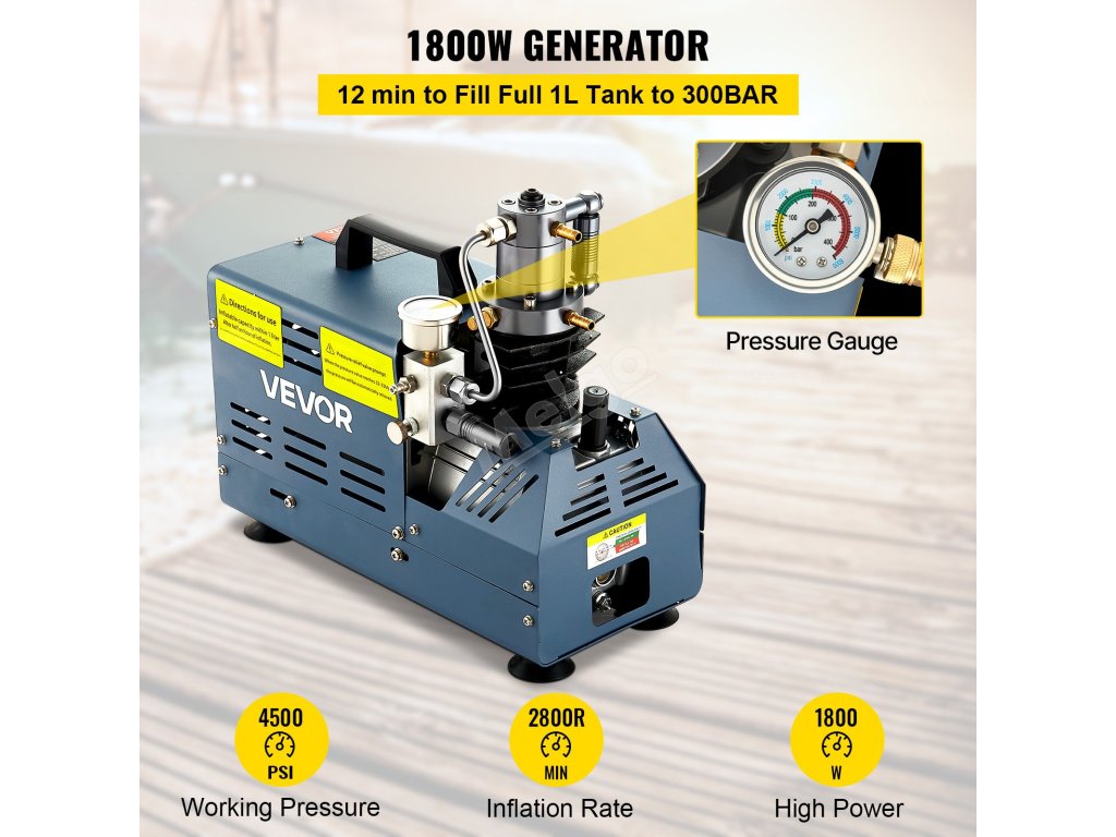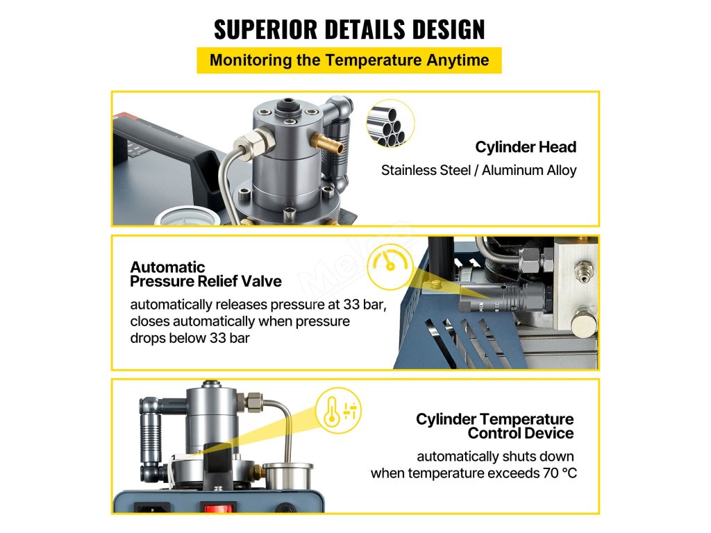 Tento 1800W vzduchový kompresor PCP je vybaven funkcí automatického zastavení a poskytuje maximální pracovní tlak 4500 PSI. Válec je vybaven zařízením pro regulaci teploty, které udržuje ideální pracovní rozsah 50-70 °C (122-158 °F). Když teplota dosáhne 70 °C (158 °F), jednotka se automaticky vypne, aby byla zajištěna bezpečnost.