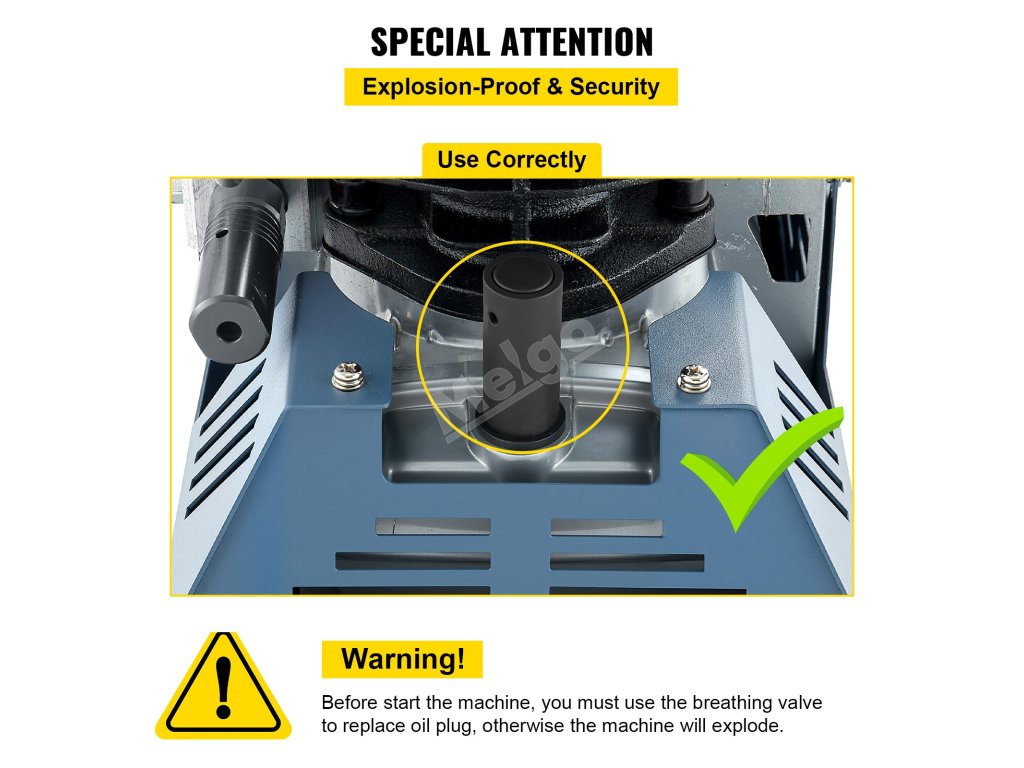 - UPOZORNĚNÍ: Před spuštěním čerpadla se ujistěte, že je do čerpadla vložen mazací olej, jinak dojde k trvalému poškození zařízení.