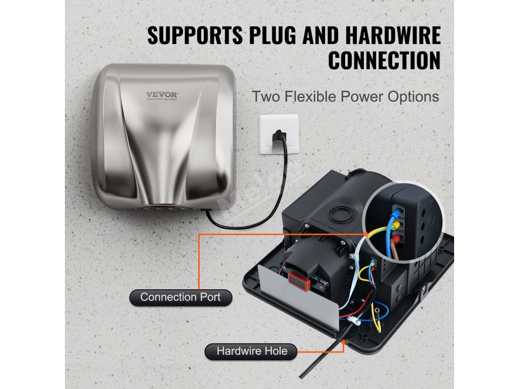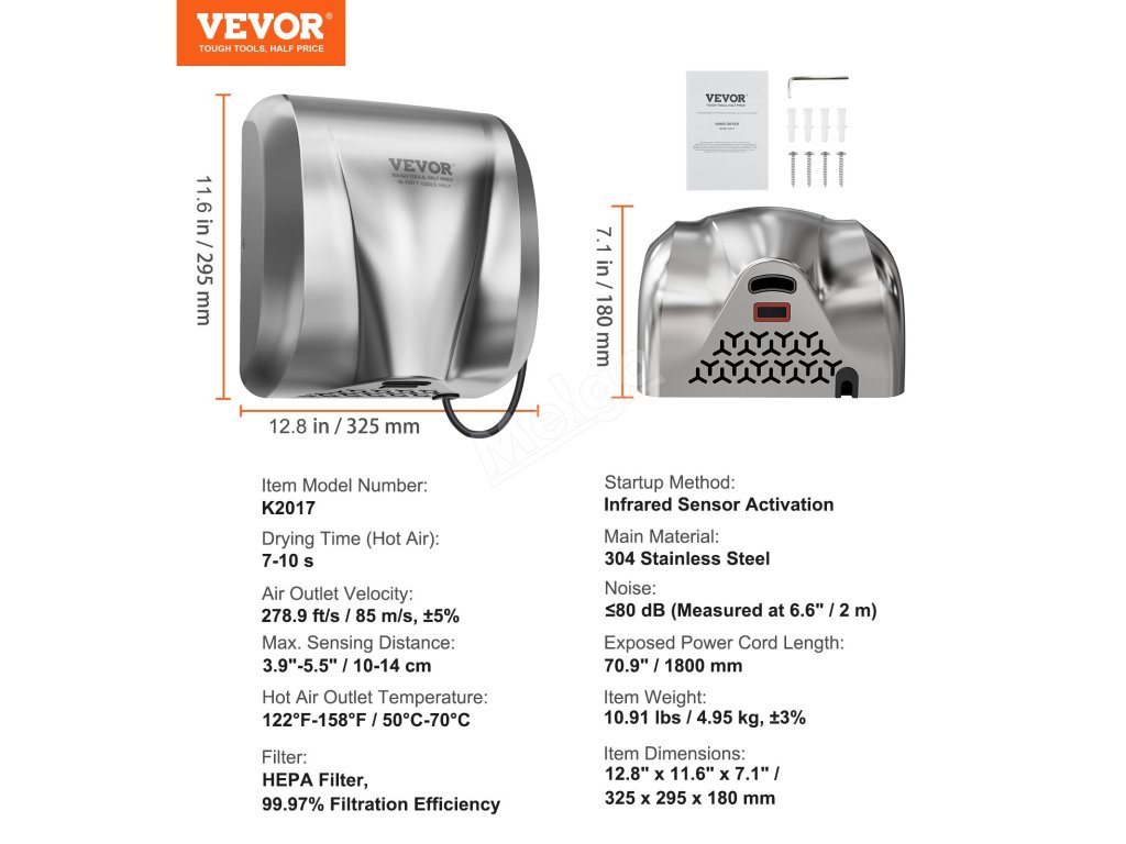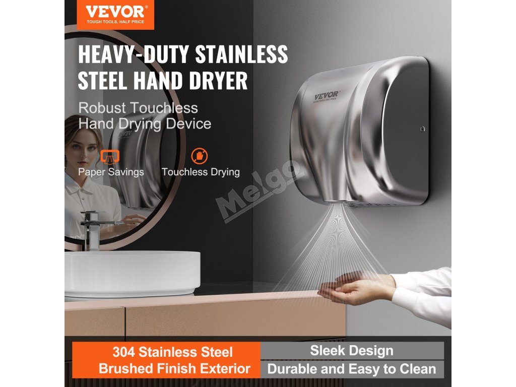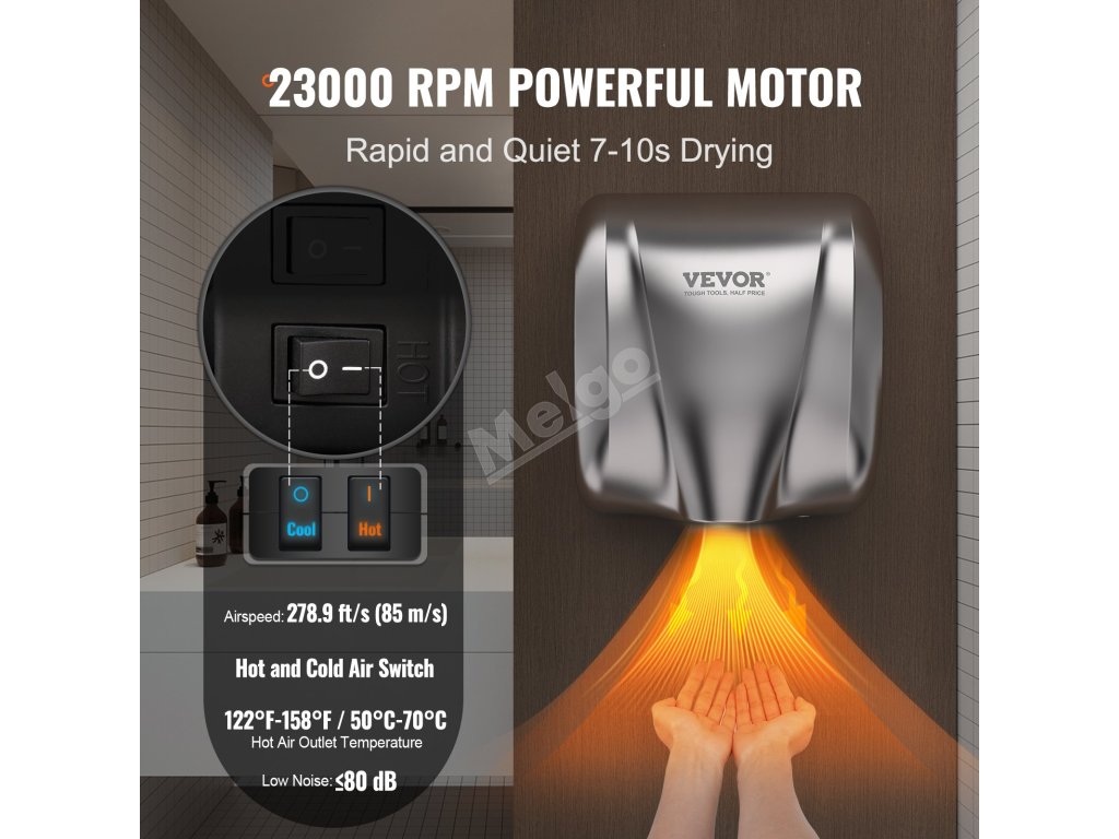 Díky době sušení pouhých 7-10 sekund nebudete muset čekat před sušičkou. Nízká hladina hluku, ≤80 dB, nebude rušit vaši běžnou konverzaci během sušení rukou.