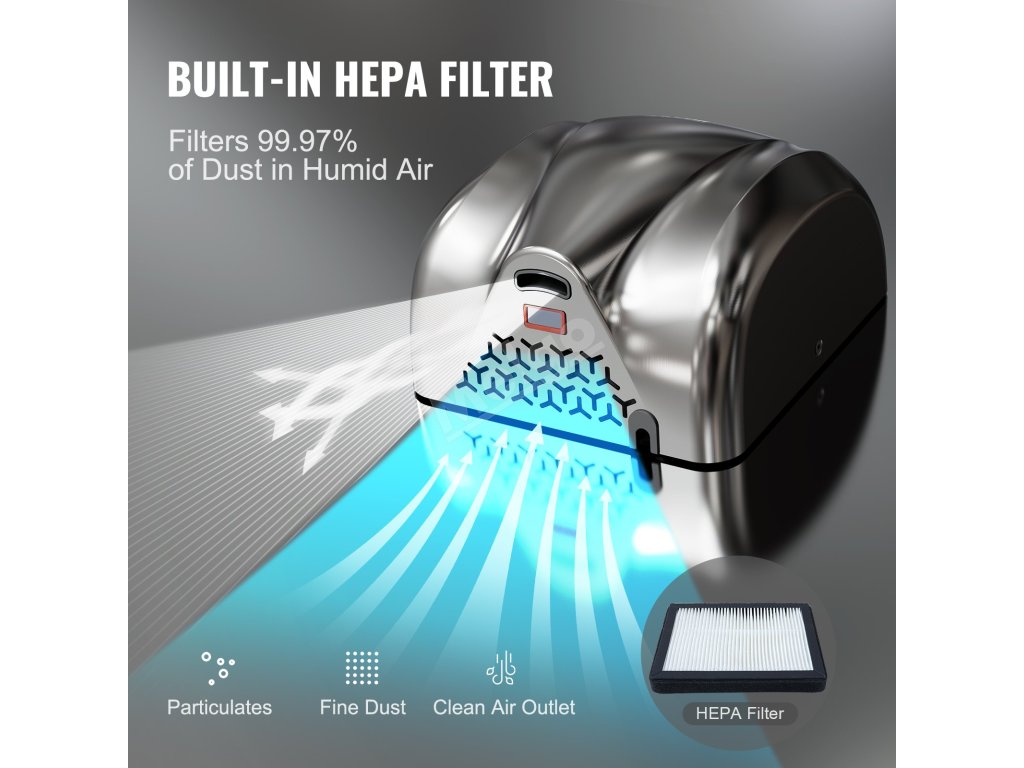 Vysoušeč rukou z nerezové oceli je vybaven vestavěným HEPA filtrem, který odstraňuje 99,97 % prachových částic z vlhkého vzduchu a zajišťuje tak čisté proudění vzduchu. Pokud zaznamenáte snížený průtok vzduchu, stačí 1-2krát vyčistit filtr, aby byl zachován optimální výkon.