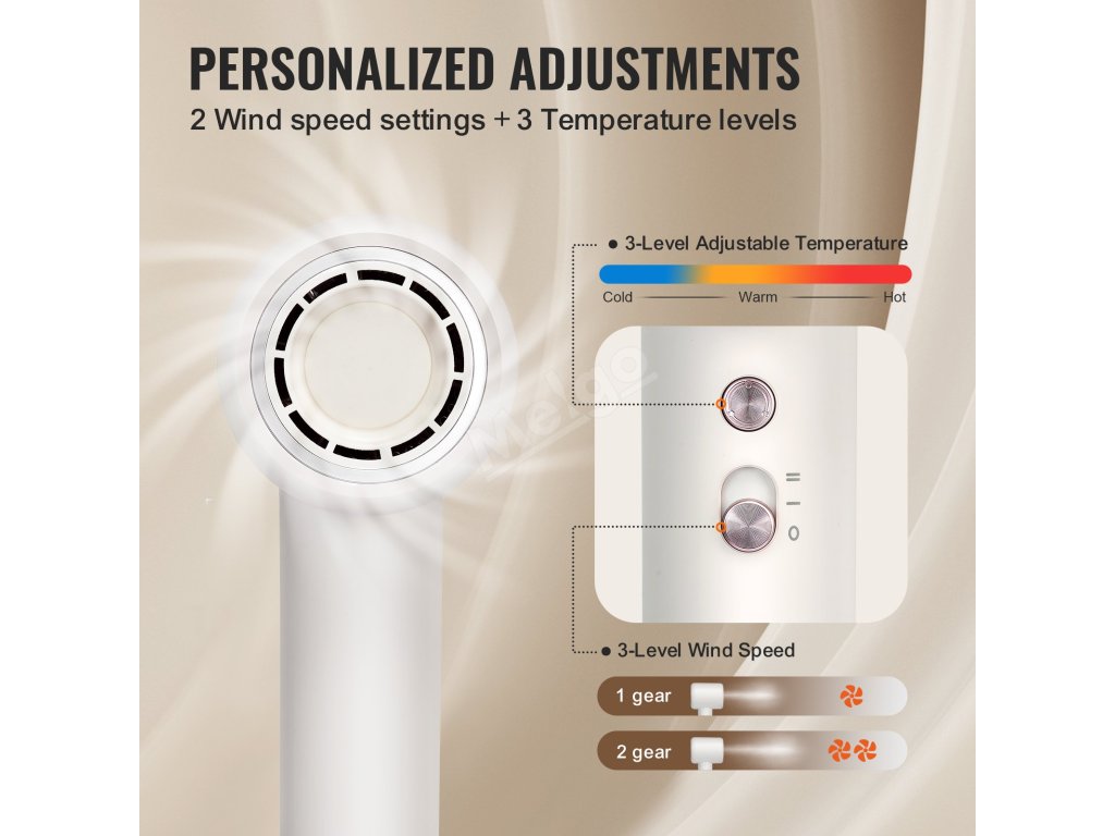 Díky 2 rychlostem proudění vzduchu (nízká/vysoká) a 3 úrovním tepla (studený/teplý/horký) se můžete flexibilně přizpůsobit svým potřebám při úpravě vlasů. Modernizované 3barevné LED teplotní kroužky a personalizované ovládání proudu vzduchu usnadňují vysoušení vlasů a nabízejí vám individuální péči o vlasy.