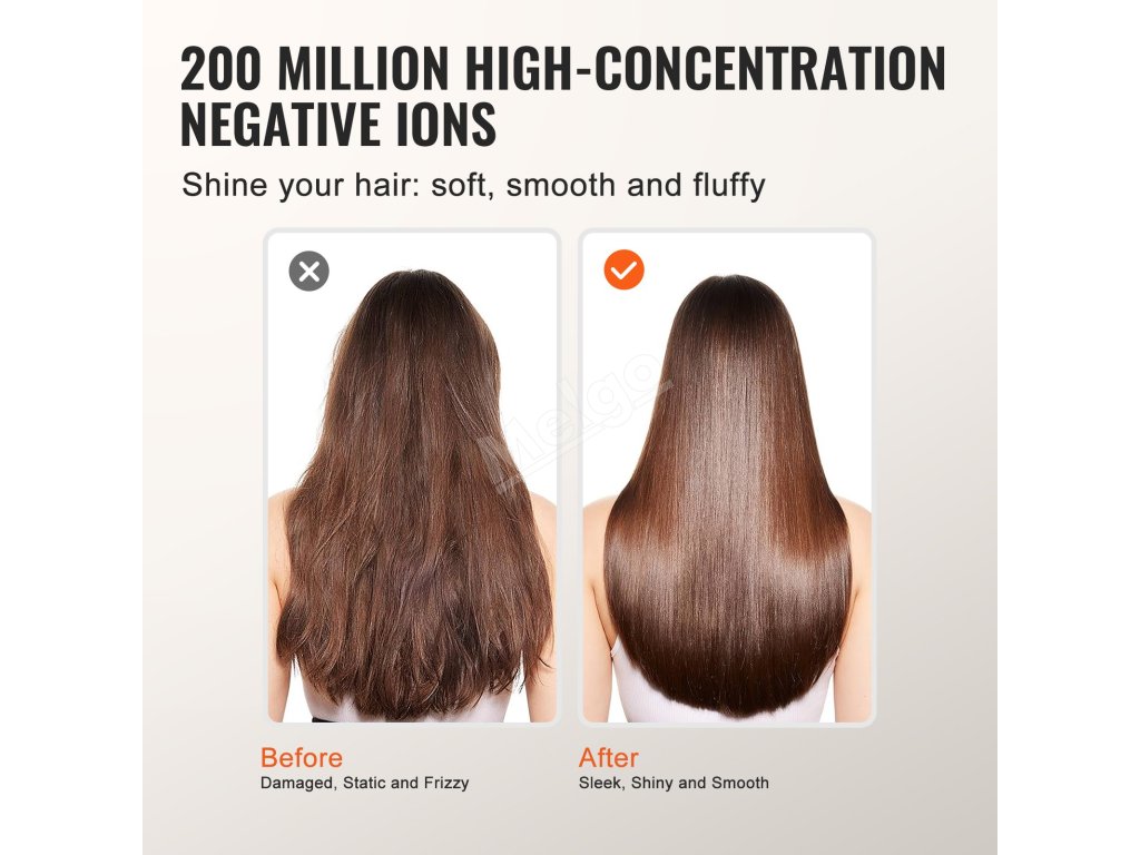Ošetřete své vlasy 200 miliony vysoce koncentrovaných záporných iontů, které účinně minimalizují statickou elektřinu a krepatění a zanechávají vlasy hedvábně hladké. Náš fén uzamyká vlhkost, udržuje přirozenou hydrataci, čímž snižuje vysušování a poškození a nakonec podporuje zdravé a lesklé vlasy.