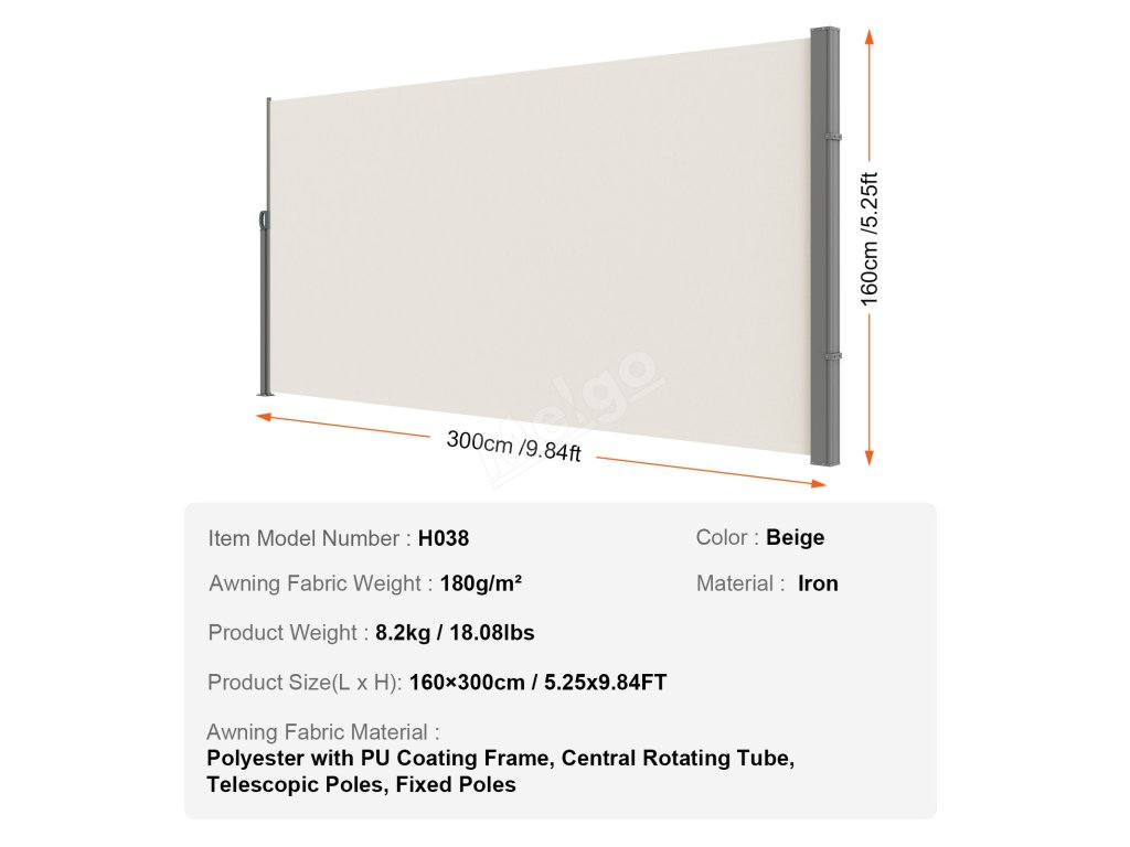 Boční markýza je vyrobena z polyesterové tkaniny o vysoké hustotě 180 g/m² s robustní PU vrstvou, která zajišťuje vynikající voděodolnost a pevnost v tahu. Se stupněm ochrany UV30+ chrání vás i vaši rodinu před UV zářením. Užívejte si pobyt venku bez obav o počasí!