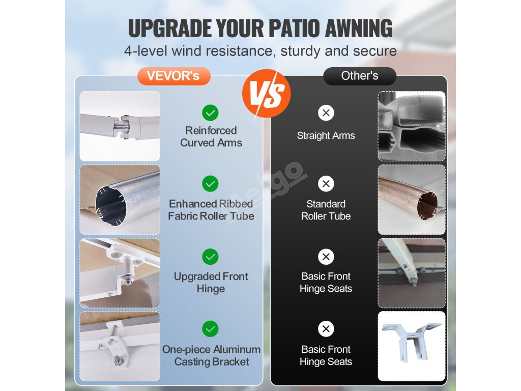 Tato ručně zatahovací markýza je podepřena silnými ocelovými trubkami, které zajišťují stabilitu a odolnost proti větru až do úrovně 4. Hliníkový válec a tkanina poskytují pevnou oporu a zabraňují prohýbání a ohýbání.