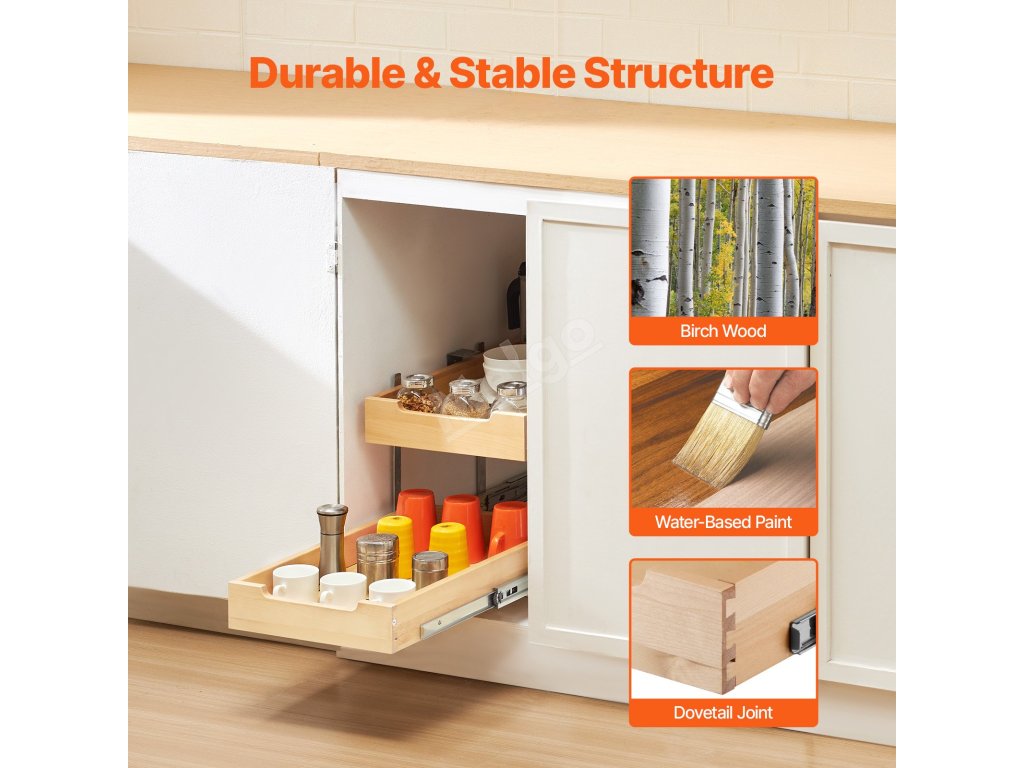 Masivní dřevěná konstrukce výsuvného organizéru do kuchyňské skříňky zajišťuje pevnost a dlouhou životnost. Je vyroben z březového dřeva a dodá vaší kuchyni elegantní vzhled. Lakový nátěr zabraňuje vyblednutí dřeva, zatímco konstrukce s holubičím ocasem zajišťuje zvýšenou odolnost.