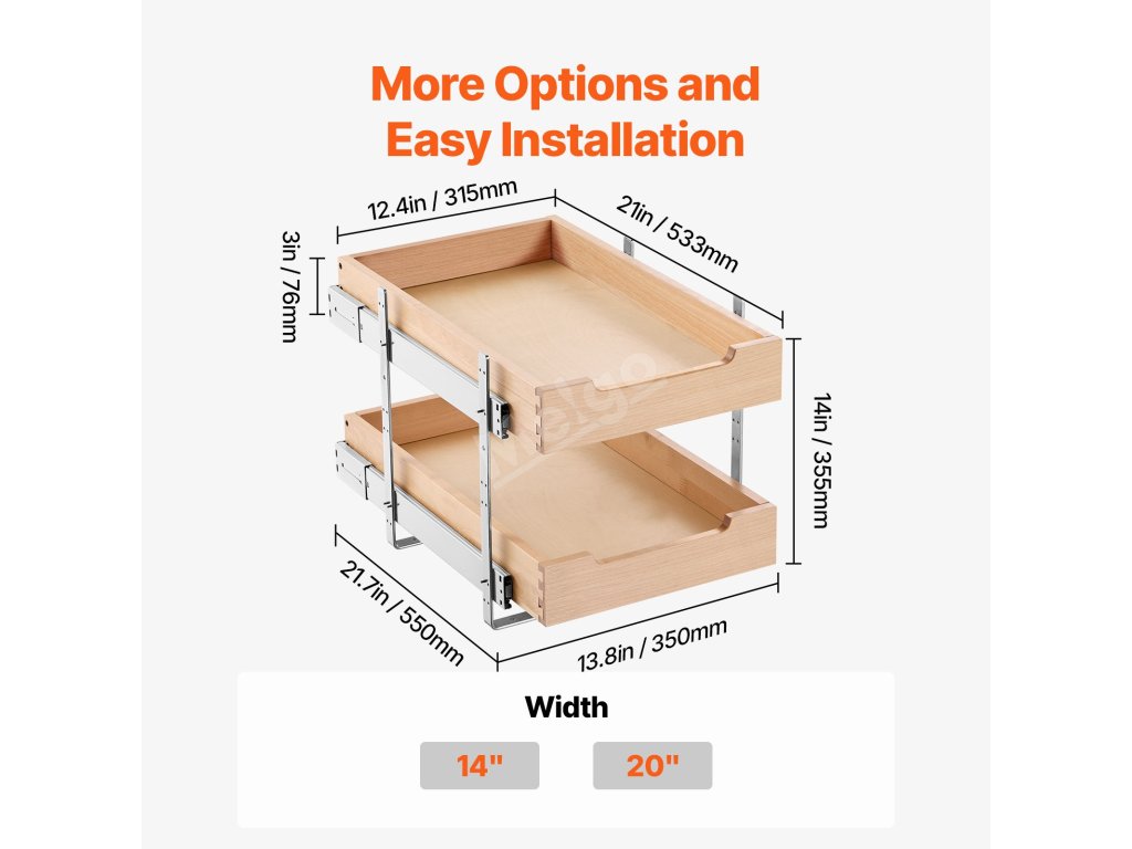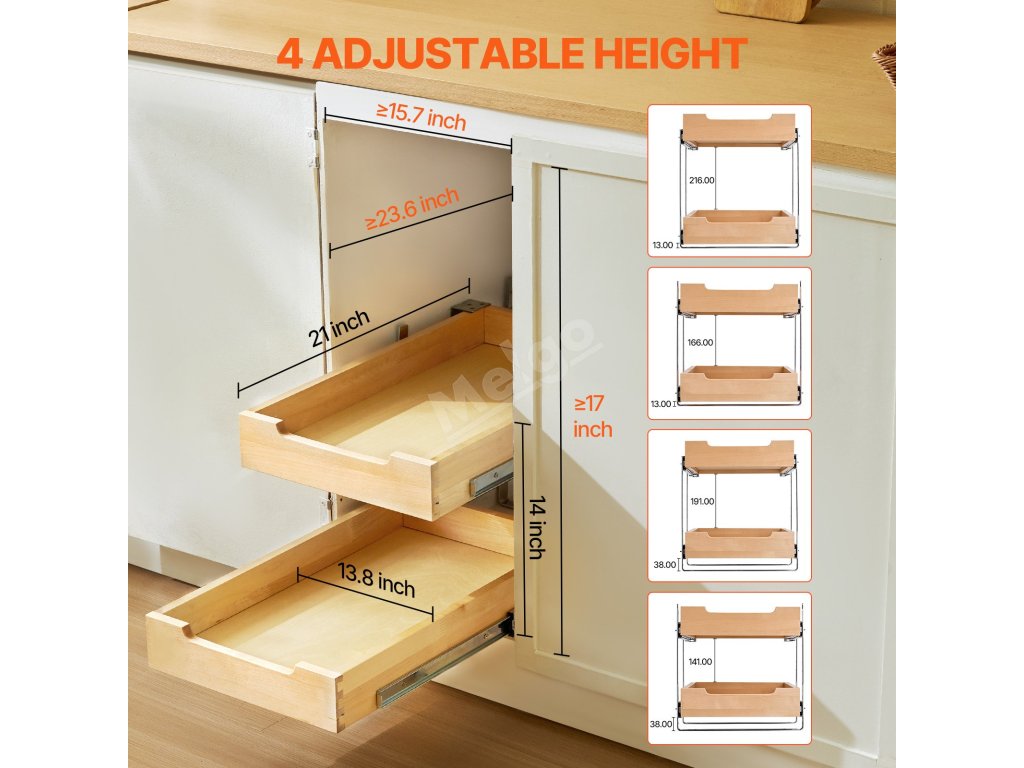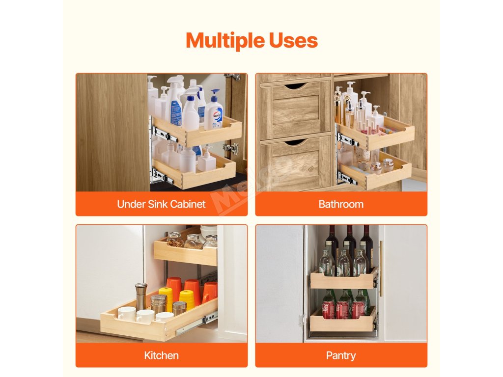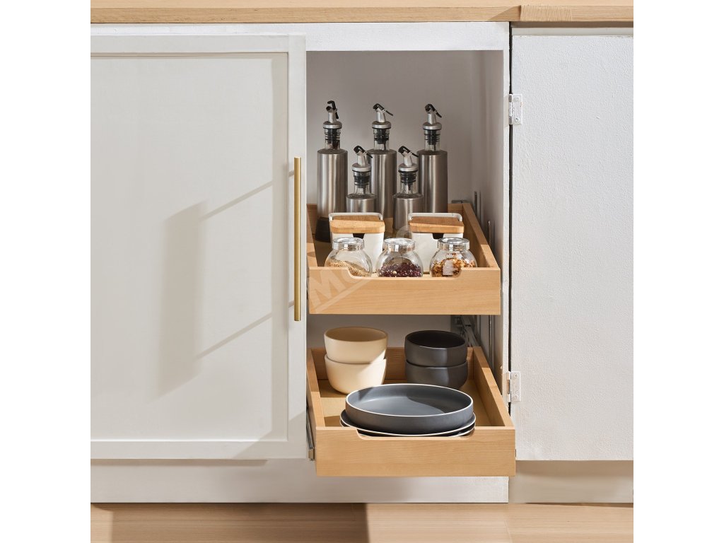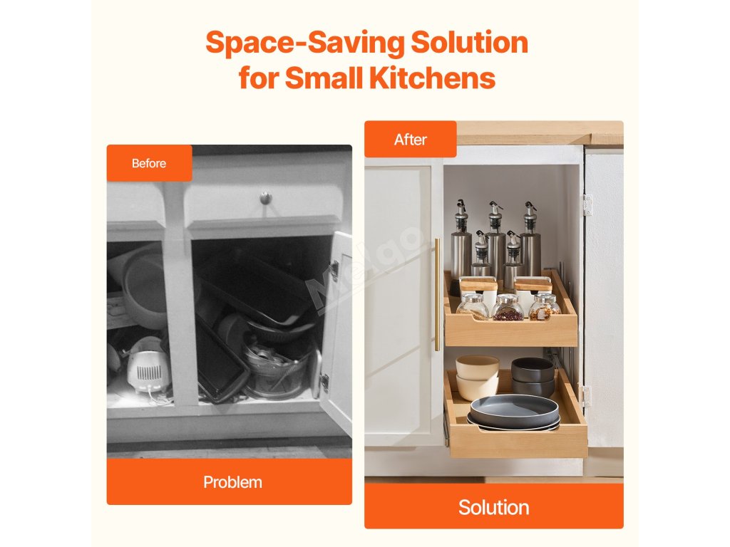 Tato výsuvná dřevěná police s měkkým zavíráním je ideální pro použití ve skříních, skříňkách pod dřezem a úložných skříňkách. Maximalizuje využití prostoru a usnadňuje ukládání a přístup k hrncům, pánvím a kuchyňskému nářadí. Její elegantní a nadčasový design skvěle doplní každou kuchyni.