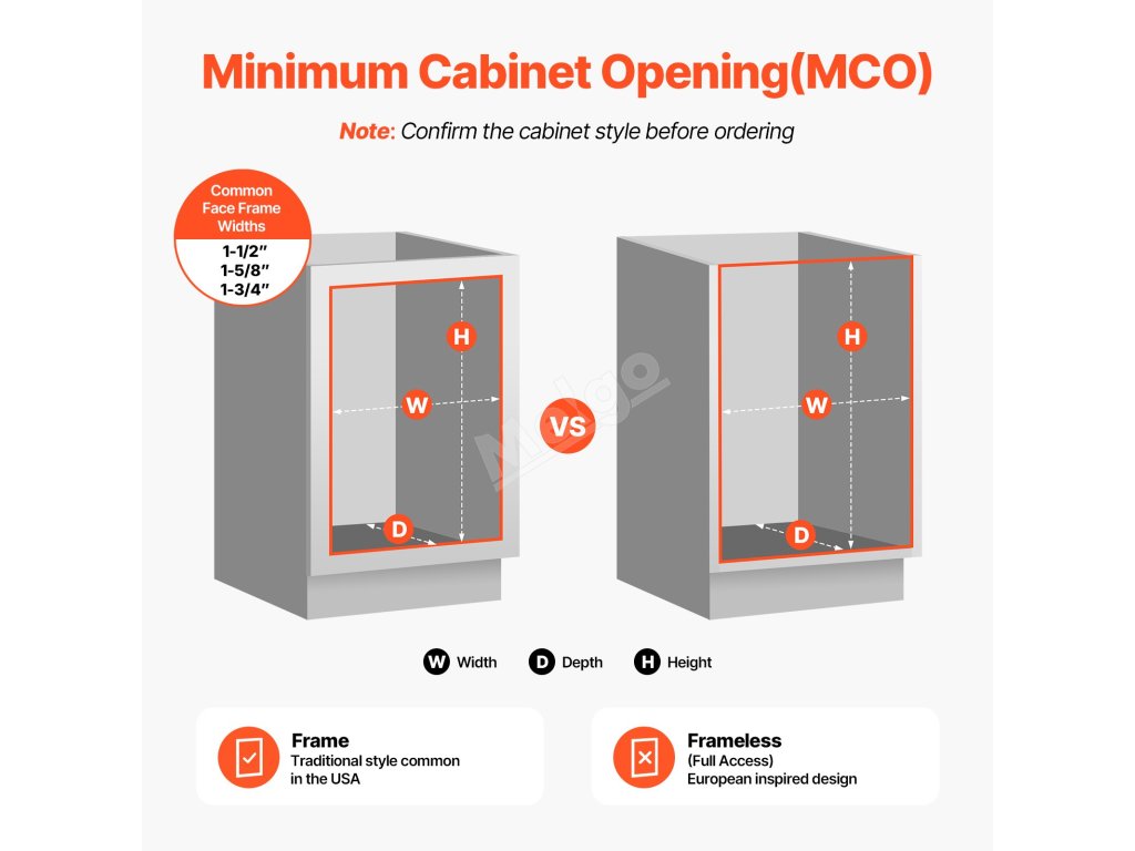 Před instalací se ujistěte, že je vaše skříňka bezrámová nebo bezrámová. Po potvrzení stylu změřte rozměry. Doporučené rozměry skříňky: hloubka: ≥ 565 mm/22 palců; šířka: ≥ 380 mm/15 palců; svislá výška: ≥ 610 mm/24 palců.