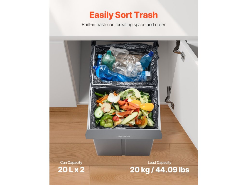 Náš výsuvný odpadkový kôš rieši všetky problémy. Ponúka dostatok priestoru na uloženie odpadu, čím eliminuje potrebu častého vynášania odpadu. Vďaka hladkým posuvným koľajničkám môžete nádobu zasúvať a vysúvať bez námahy, bez hluku a prekážok.