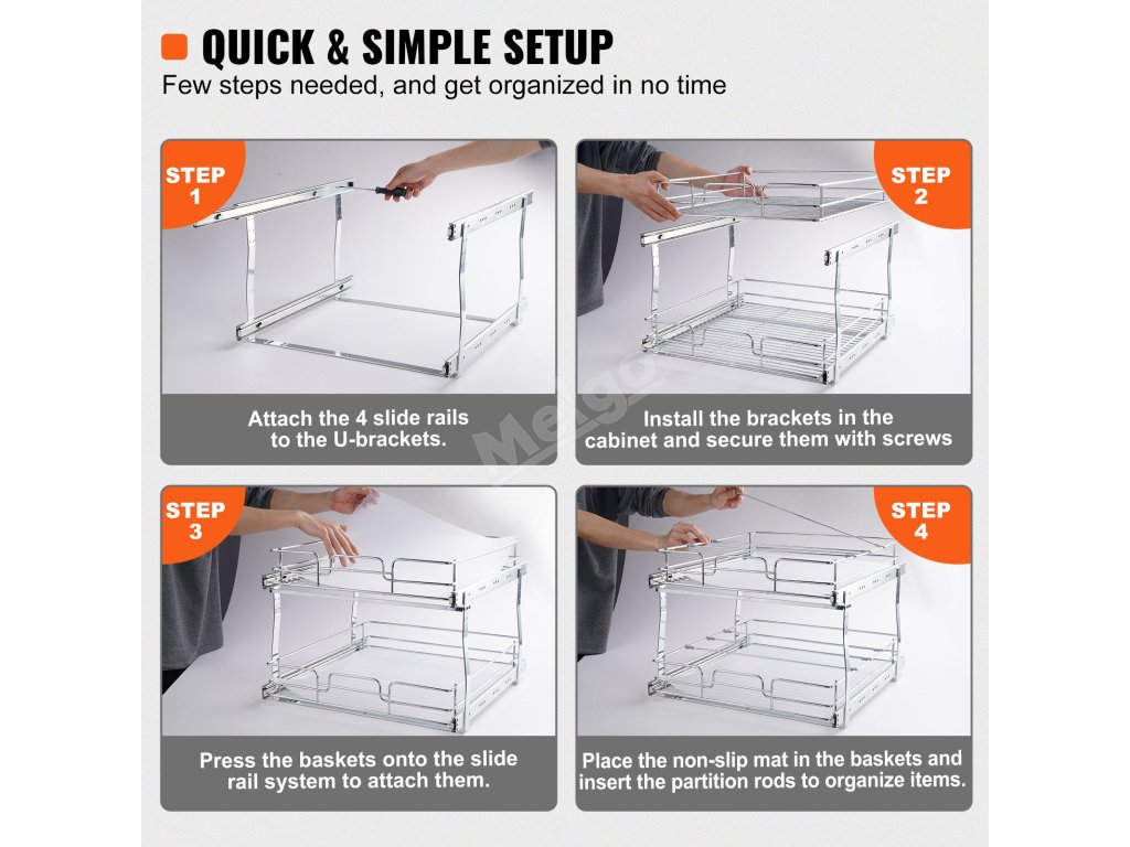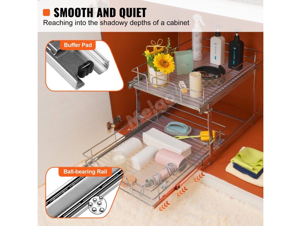 Výsuvný organizér do skrine VEVOR je vyrobený zo silnej pochrómovanej ocele. Zakaždým poskytuje hladkú a spoľahlivú prevádzku. Výsuvy s guľôčkovými ložiskami zabezpečujú bezproblémové posúvanie zásuviek. Vďaka tomu je prístup k vašim predmetom jednoduchý a pohodlný. Pevná konštrukcia. Organizér zvládne veľké zaťaženie. Nemusíte sa obávať, že sa bude kývať alebo rozbije. Použité materiály sú vysoko kvalitné, čo zvyšuje odolnosť. Vďaka tejto bezproblémovej prevádzke je jeho každodenné používanie príjemné. Je efektívnym riešením na usporiadanie vašej kuchyne alebo kúpeľne.
