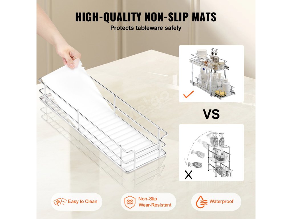 Matný povrch z vysoce kvalitního PP materiálu zajišťuje vynikající protiskluzové vlastnosti, které udrží nádobí a kuchyňské náčiní bezpečně na místě. Odolnou, voděodolnou a snadno čistitelnou výsuvnou polici skříňky lze otřít vlhkým hadříkem nebo opláchnout pod vodou.
