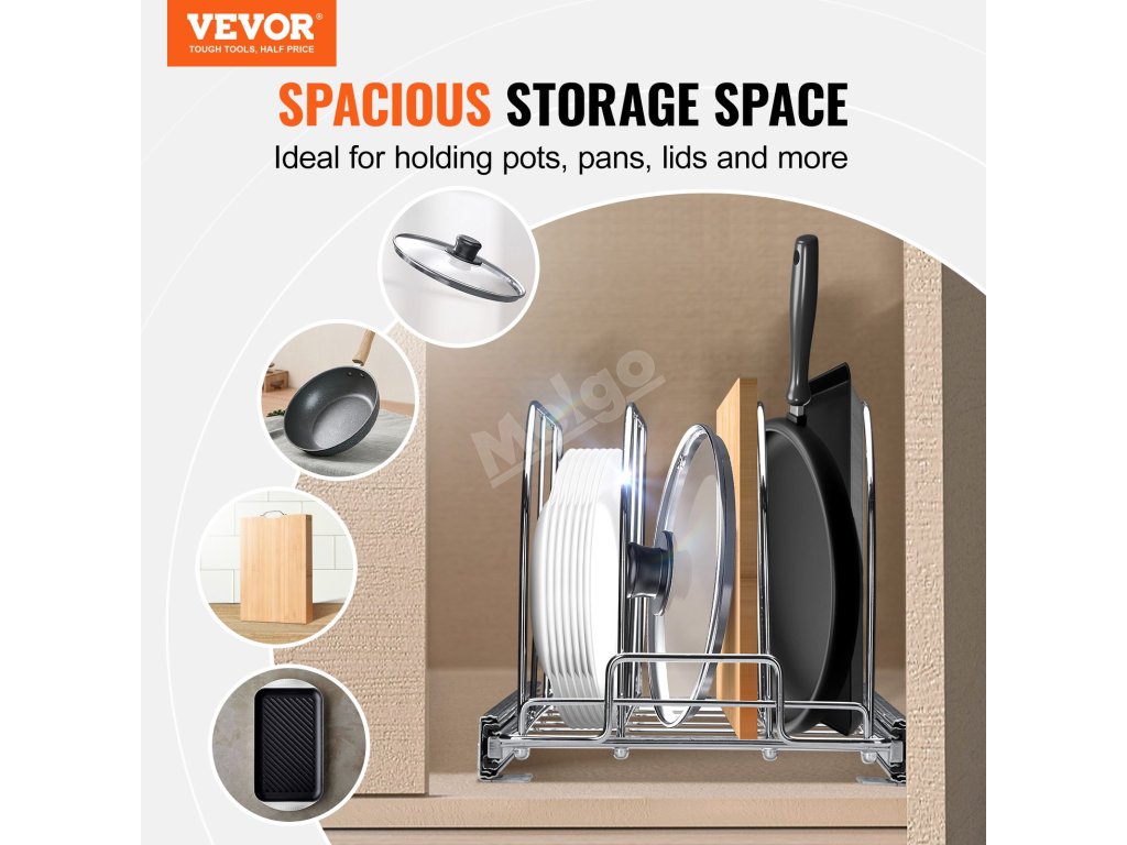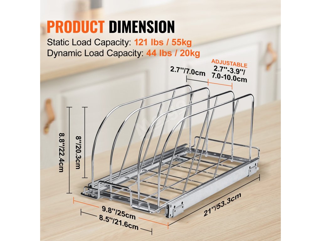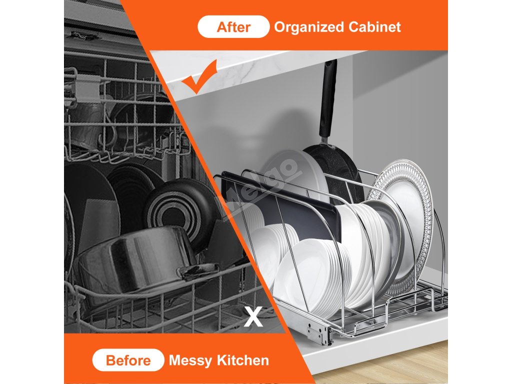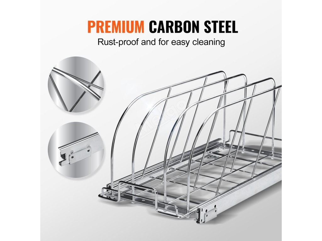 Náš stojan na pánve a hrnce je navržen tak, aby maximalizoval prostor v kuchyni. Je ideální pro ukládání hrnců, pánví, prkének na krájení, pokliček a dalších předmětů. Tento úložný regálový organizér vyrobený z uhlíkové oceli se snadno vysouvá a umožňuje vám snadný přístup a výběr toho, co potřebujete.