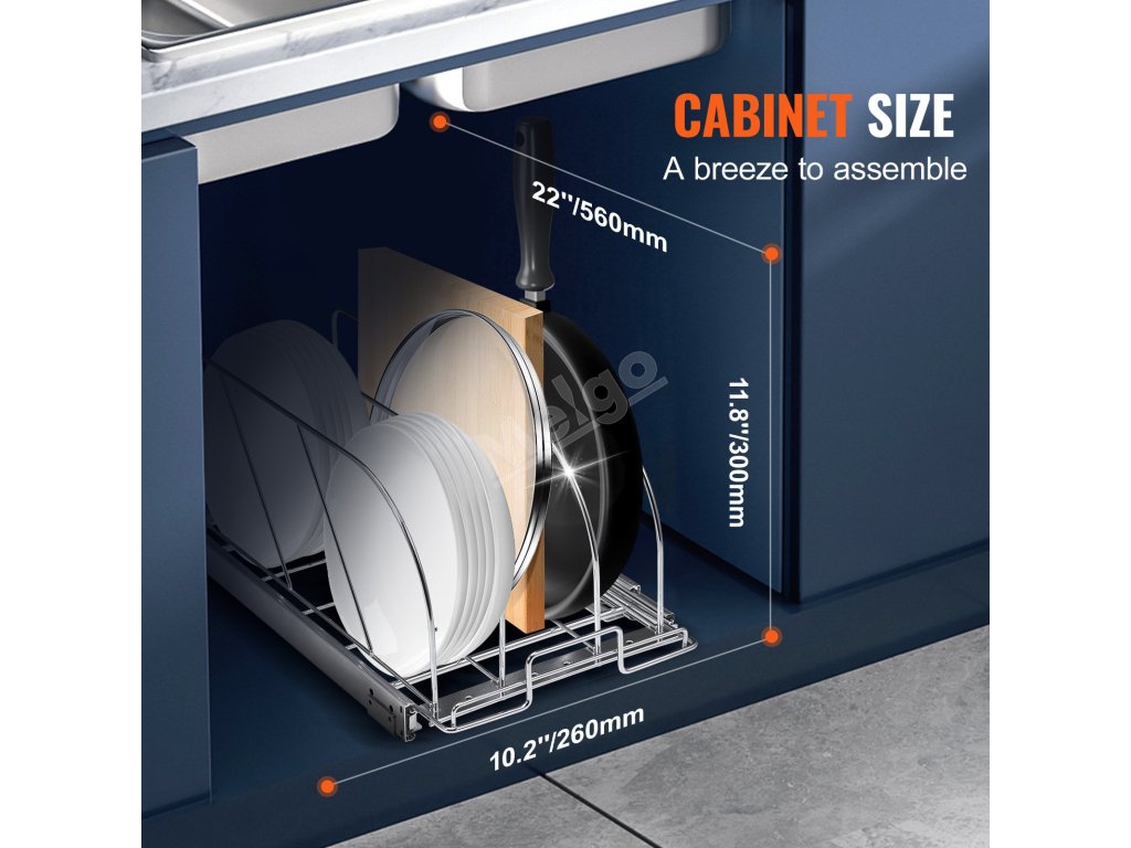 Nejprve zkontrolujte velikost skříně. Tento stojan se používá ve skříních o rozměrech 10,2 × 22 × 11,8 palce. Náš odolný organizér na krájecí prkénka lze nainstalovat pomocí několika jednoduchých šroubů, takže můžete snadno uspořádat své skříňky.