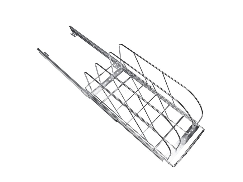 Náš kuchyňský úložný regál je vybaven plně výsuvnou třídílnou posuvnou lištou s kuličkovými ložisky pro hladký posuv a větší úložnou kapacitu, která snadno pojme velké hrnce.