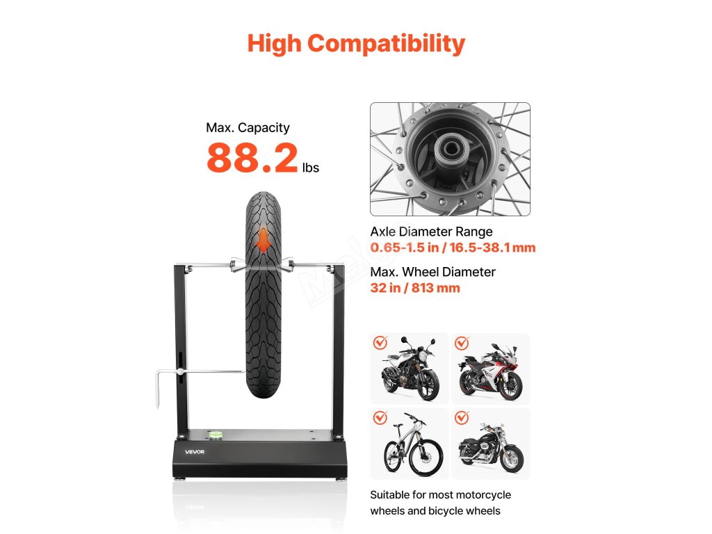 Tato univerzální vyvažovačka kol motocyklů využívá pružný ukazatel k detekci nesouososti kola a hladká ložiska k vyhledání tvrdých míst. Součástí je 5 závaží o hmotnosti 10 g pro obnovení vyvážení ráfku, dokud kolo nezůstane v libovolné poloze.