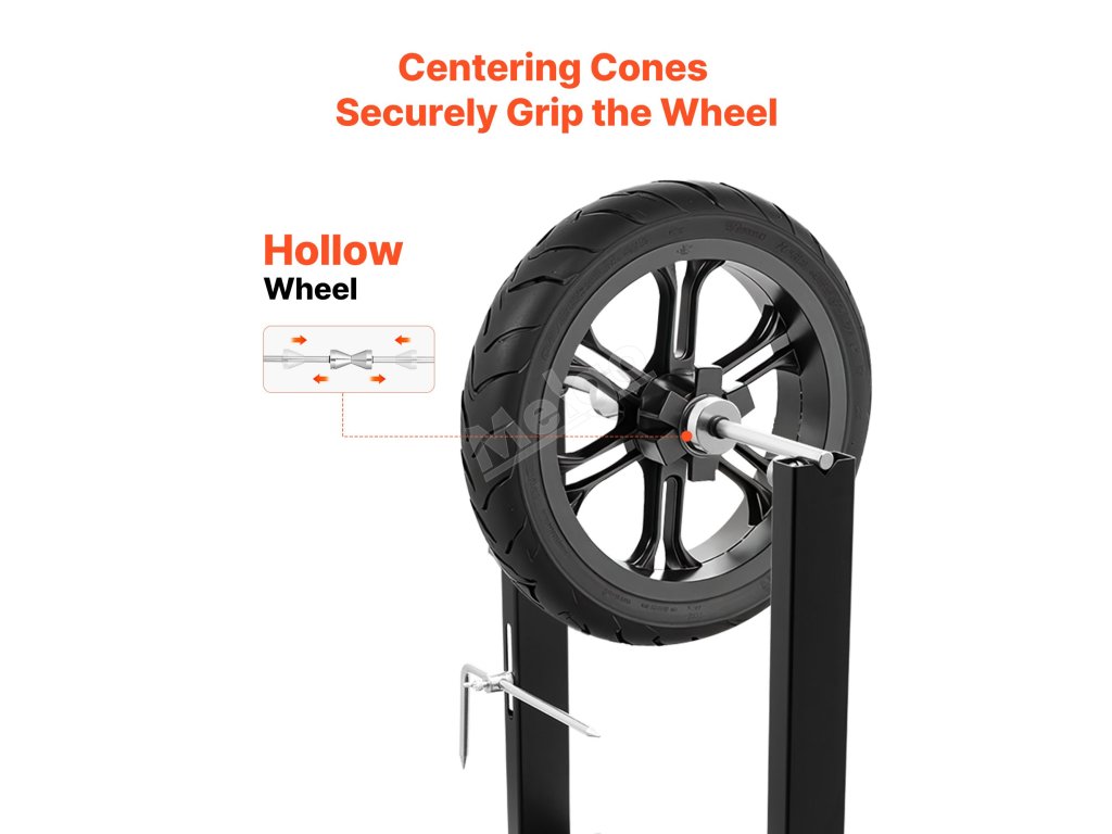 Náš stojan na vyvažování kol motocyklů je určen pro moderní motocykly s dutou nápravou a obsahuje sadu nastavitelných středicích kuželů, které jsou vhodné pro většinu silničních motocyklů, cestovních motocyklů a motocyklů pro dobrodružné cesty.