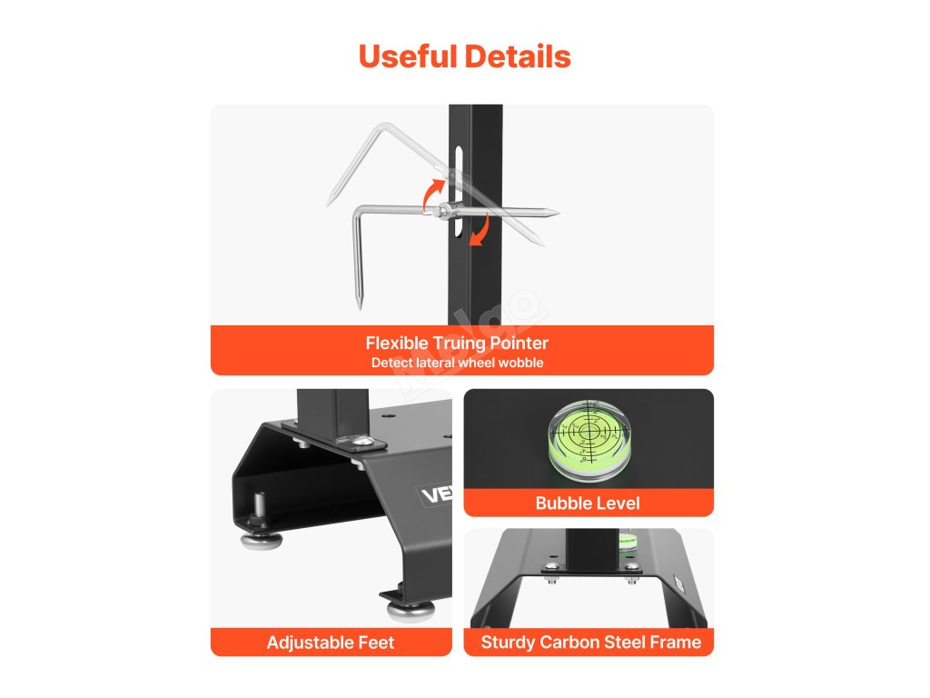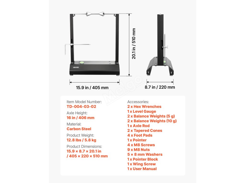 Tento stojan na vyvažování pneumatik je vyroben z odolné uhlíkové oceli a má čtyři nastavitelné vyvažovací nožičky pro stabilní základnu. Bublinková vodováha pomáhá kontrolovat vyrovnání, takže vždy dosáhnete profesionálních výsledků.