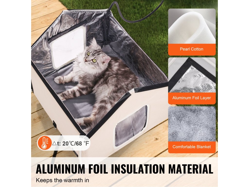 Tento přístřešek pro kočky je vybaven vestavěnou vyhřívací podložkou a měkkou dekou, která udržuje tělesnou teplotu vaší kočky v pohodlí. Šestistranná izolační vrstva z hliníkové fólie a perleťové bavlny účinně snižuje tepelné ztráty, takže v zimě udržuje interiér teplý a útulný pro vaši kočku.