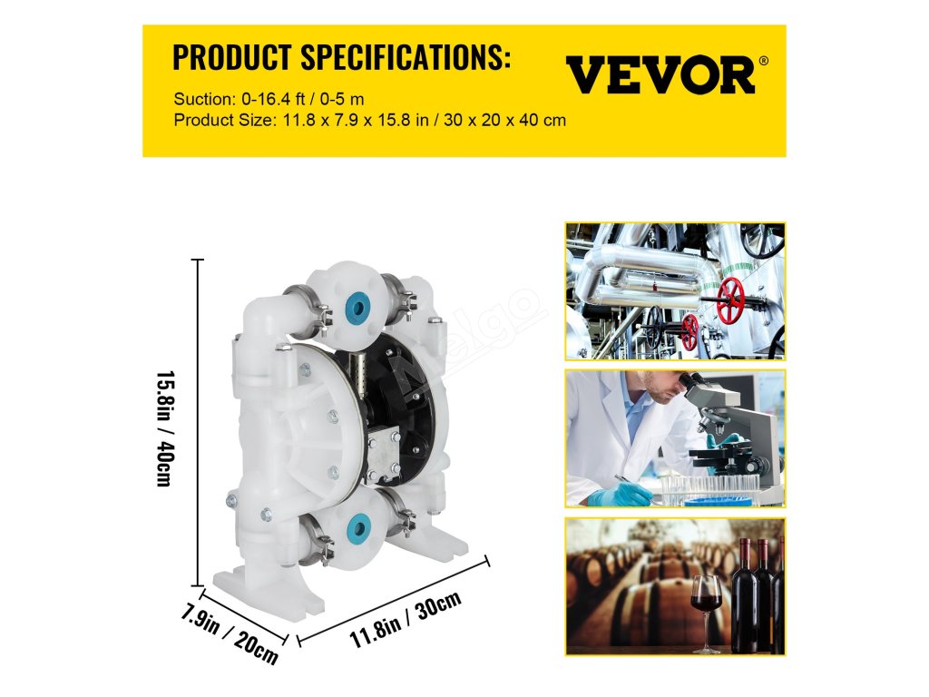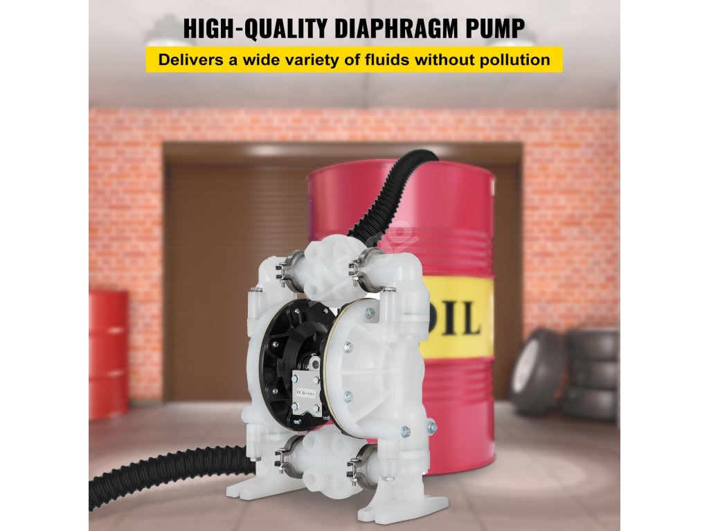 Toto membránové čerpadlo na chemické použitie, vybavené výkonným motorom, dokáže veľmi rýchlo premiestňovať veľké množstvo kvapaliny. Dokáže premiestniť až 20 galónov kvapaliny za minútu. Membránové čerpadlo s 1-palcovým vstupom/výstupom zvládne aj veľký tlak kvapaliny alebo vzduchu. Dokáže prijať až 120 PSI, čo je veľký tlak.