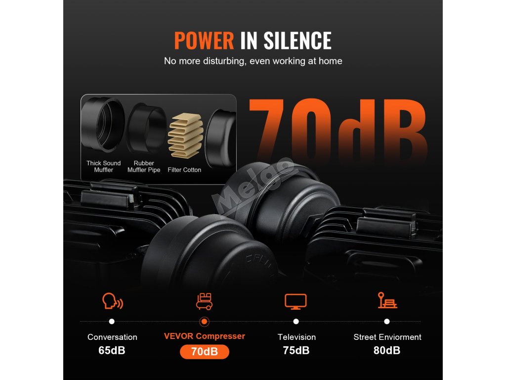 extrémně tichý kompresor s hlučností 70 dB pracuje při nízké hladině hluku. Zabudovaná filtrační vata a tlumič hluku snižují hlučnost a zároveň zabraňují vnikání jemného prachu.