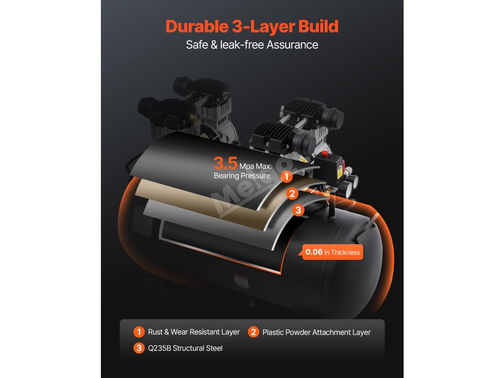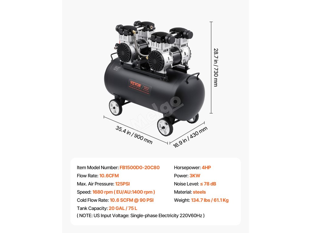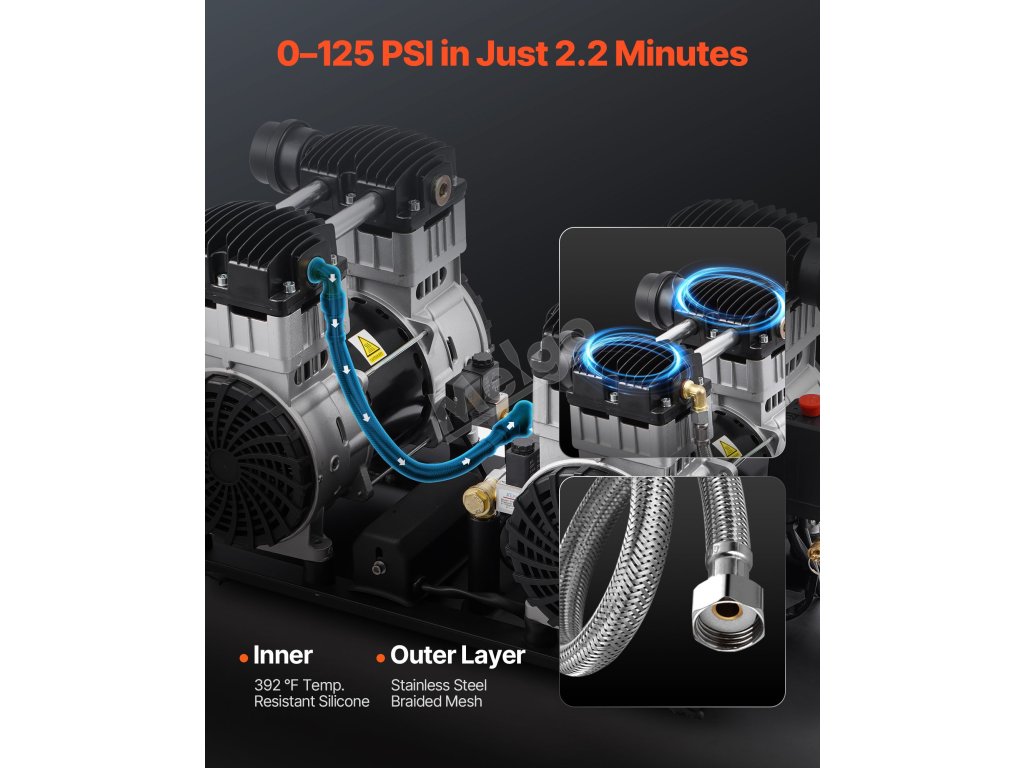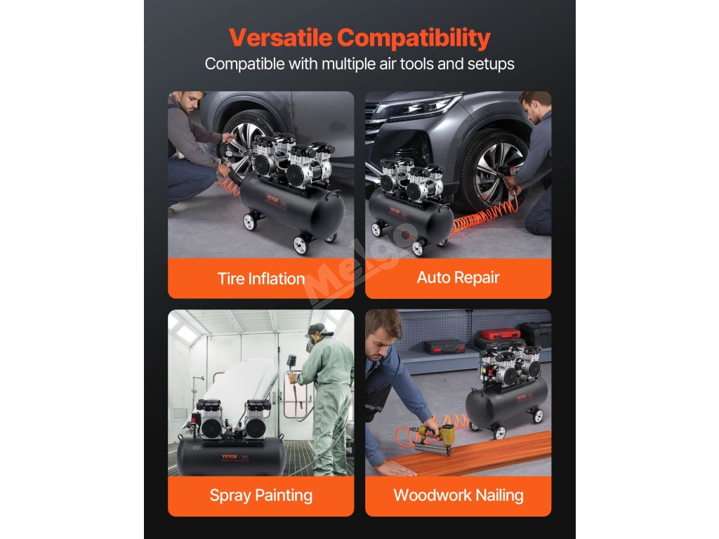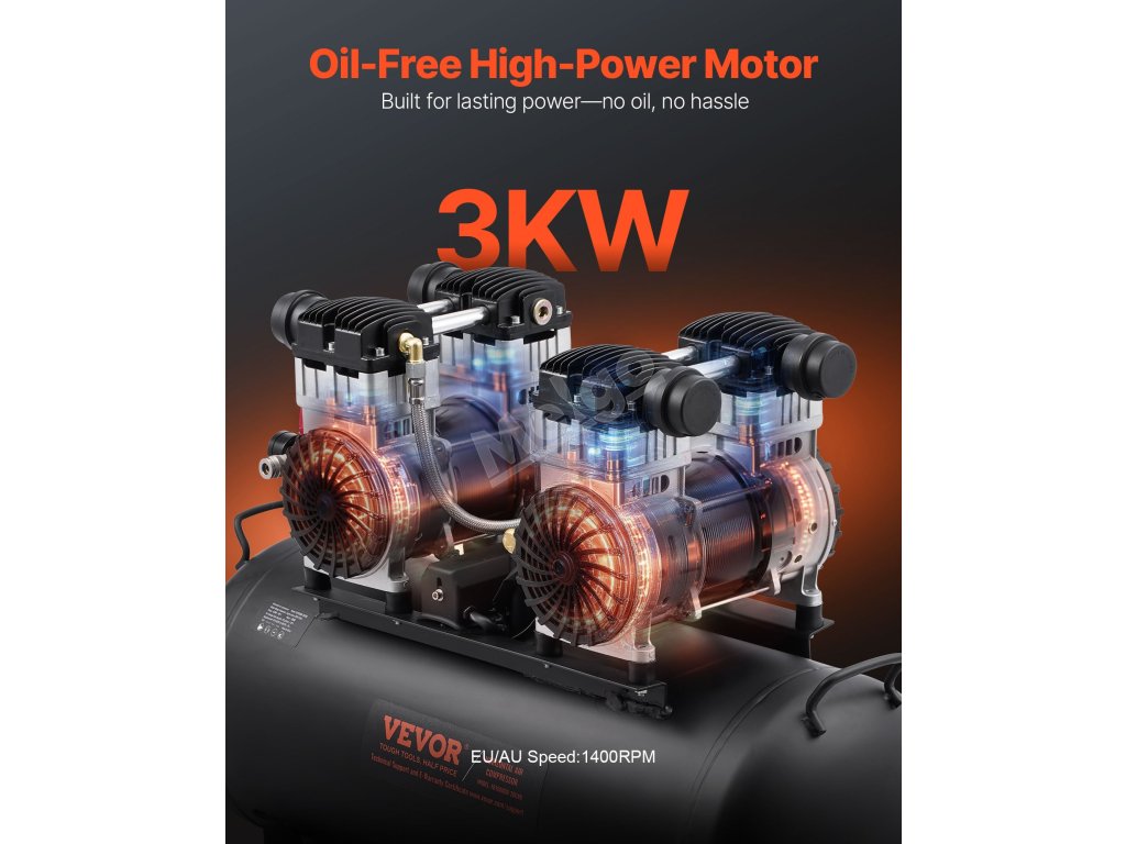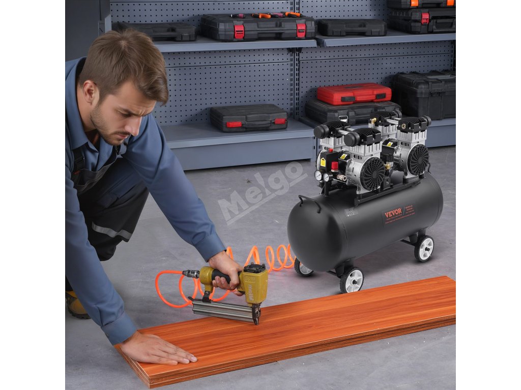 Tento horizontální vzduchový kompresor má bezolejový motor o výkonu 4 HP, který poskytuje dostatečný výkon pro splnění požadavků různých pneumatických nástrojů. Nabízí dostatečnou podporu vzduchu a výkon pro zatloukání hřebíků, lakování a další aplikace.