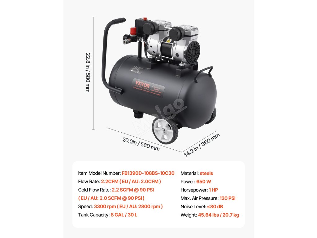 Vzduchový kompresor 8 gallon nádrž, 1hp, 2.2 cfm@90 psi, bezolejový