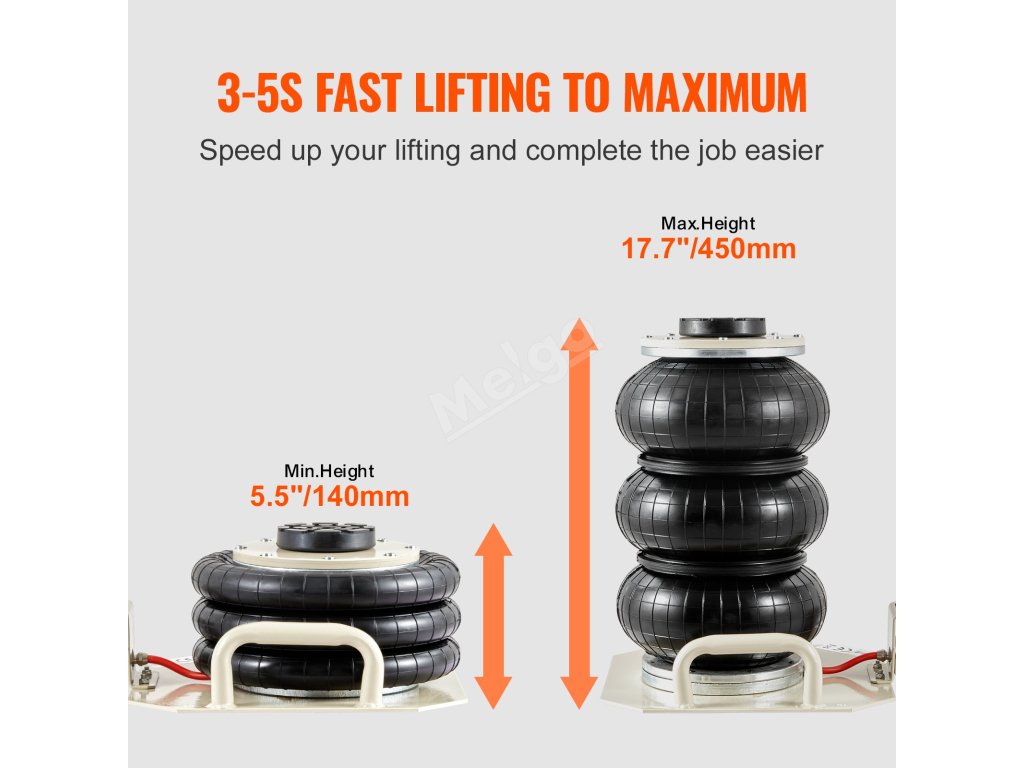Náš zvedák se vzduchovým vakem má velký rozsah výšky zdvihu 5,5-17,7 palce. Tento široký rozsah zajišťuje, že se bez problémů přizpůsobí potřebám údržby vozidel s různou výškou. Vyzkoušejte si pohodlí snadného přístupu k jakémukoli vozidlu při opravách a údržbě.