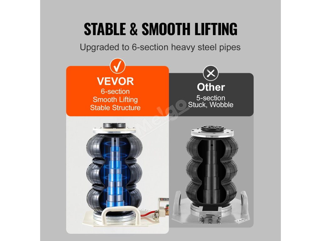 Náš vzduchový kladkostroj se 3 vaky je vybaven vnitřně optimalizovanými zvedacími díly, které nahrazují tradičních 5 ocelových trubek 6 ocelovými trubkami. Tato vědecká konstrukce zvyšuje stabilitu a zajišťuje plynulé zvedání. I při práci s těžkými vozidly se můžete spolehnout na to, že náš kladkostroj neuvízne.