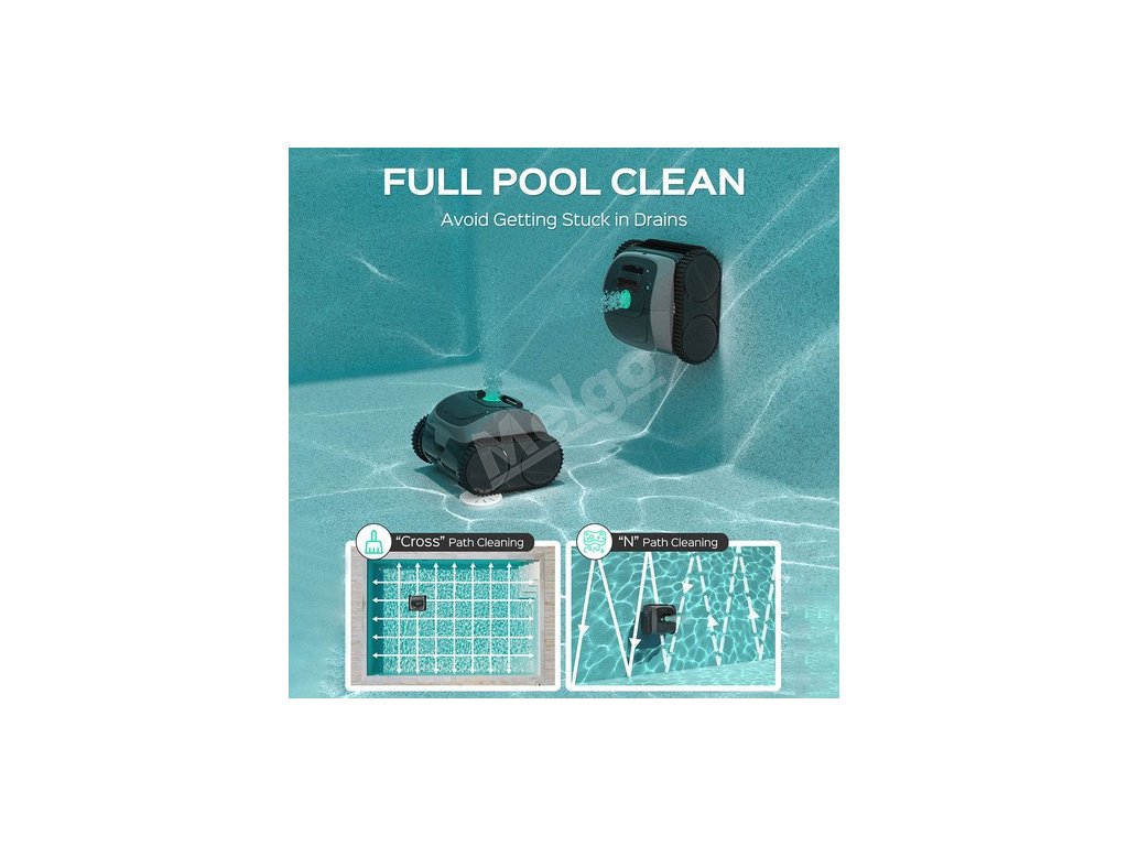 Díky přesnému polohování a inteligentní navigační technologii se čistič bazénu při čištění stěn pohybuje po dráze ve tvaru písmene N a při čištění dna bazénu po dráze ve tvaru písmene S, což zajišťuje komplexní pokrytí a optimální výsledky čištění. Díky modernizovaným motorům, kartáčům s vysokou přilnavostí a systému pohonu všech kol je stroj vhodný pro různé povrchy bazénů včetně PVC, dlaždic, mozaiky a skla.
