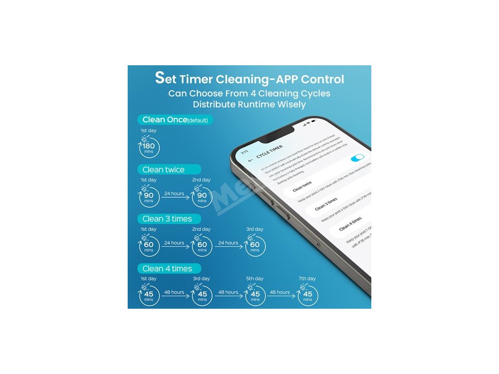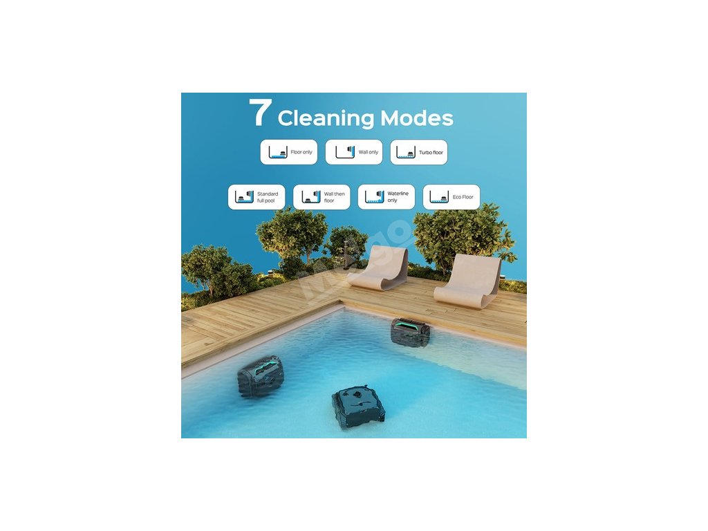 Prostřednictvím aplikace WYBOT můžete nastavit časovače a naplánovat čištění bazénu předem, k dispozici jsou 4 možnosti časových cyklů. Vyberte si ze 7 režimů čištění, včetně standardního čištění celého bazénu, čištění pouze podlahy, čištění pouze stěn, čištění pouze vodní linie, čištění stěn a poté podlahy, čištění podlahy Eco a čištění podlahy Turbo. Kromě toho je k dispozici 6 čisticích pruhů pro podlahy a stěny. Průběžné aktualizační služby OTA udržují váš bazénový vysavač optimalizovaný s nejnovějšími funkcemi. Poznámka: Při vysávání na břehu přednastavte režim robota.