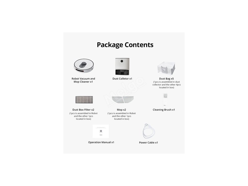 | Obsah balenia | 1 x Robotický vysávač 1 x Samoprázdna stanica 5 x Vrecko na prach 2 x Filter do boxu na prach 2 x Mop 1 x Čistiaca kefa 1 x Napájací kábel 1 x Návod na použitie |