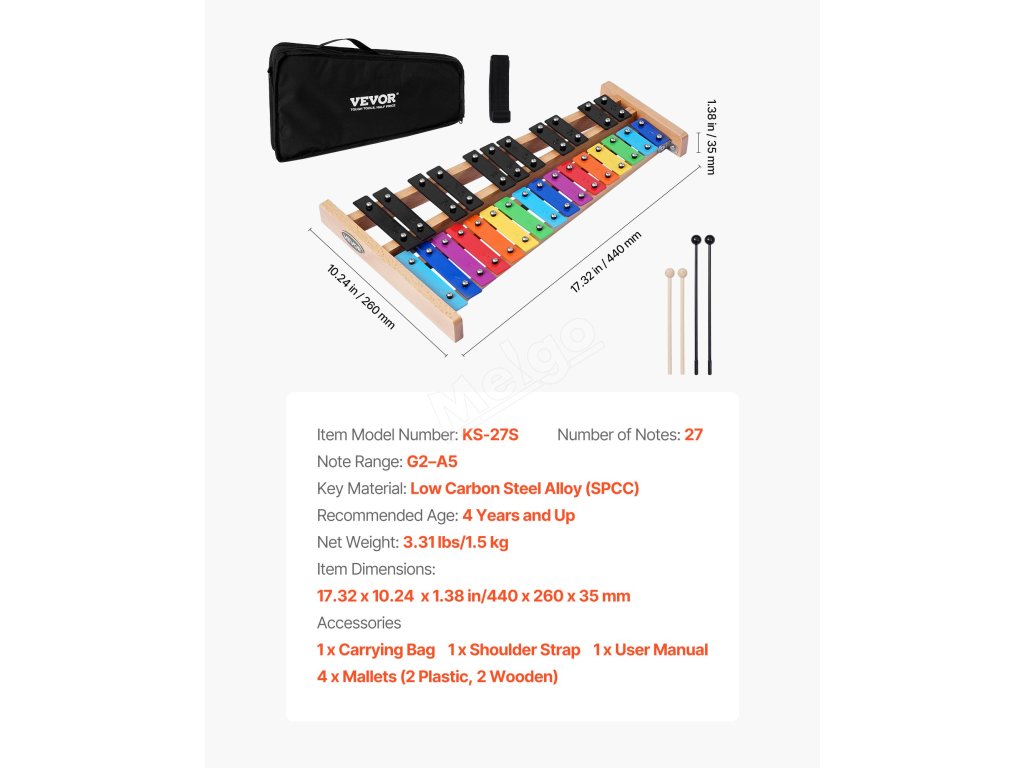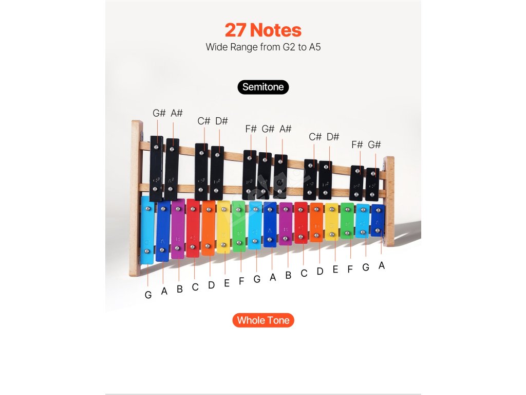 Tento zvonkohra s podstavcem z přírodního dřeva a barevnými kovovými klávesami je vizuálně přitažlivá a zvukově příjemná pro milovníky hudby všech věkových kategorií. Je vhodný pro ranou hudební výchovu, školní kapely nebo i profesionální vystoupení.