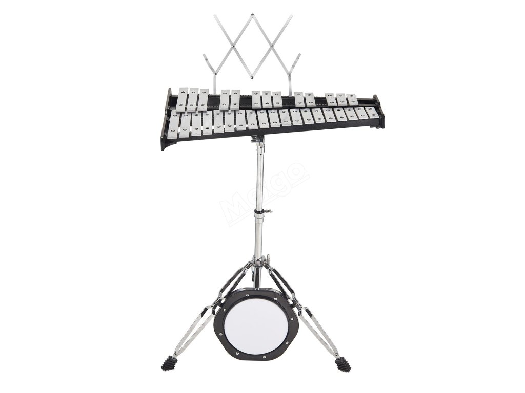 Profesionální zvonkový xylofon s 32 tóny obsahuje: xylofon s 32 tóny x1, tašku na přenášení x1, nastavitelný stojan x1, notový stojan x1, cvičnou podložku x1, paličky x4, paličky x2, návod k použití x1, svorky x2 a 8palcovou cvičnou podložku. Široký rozsah tónů od F5 do C8 zajišťuje pohodlí!