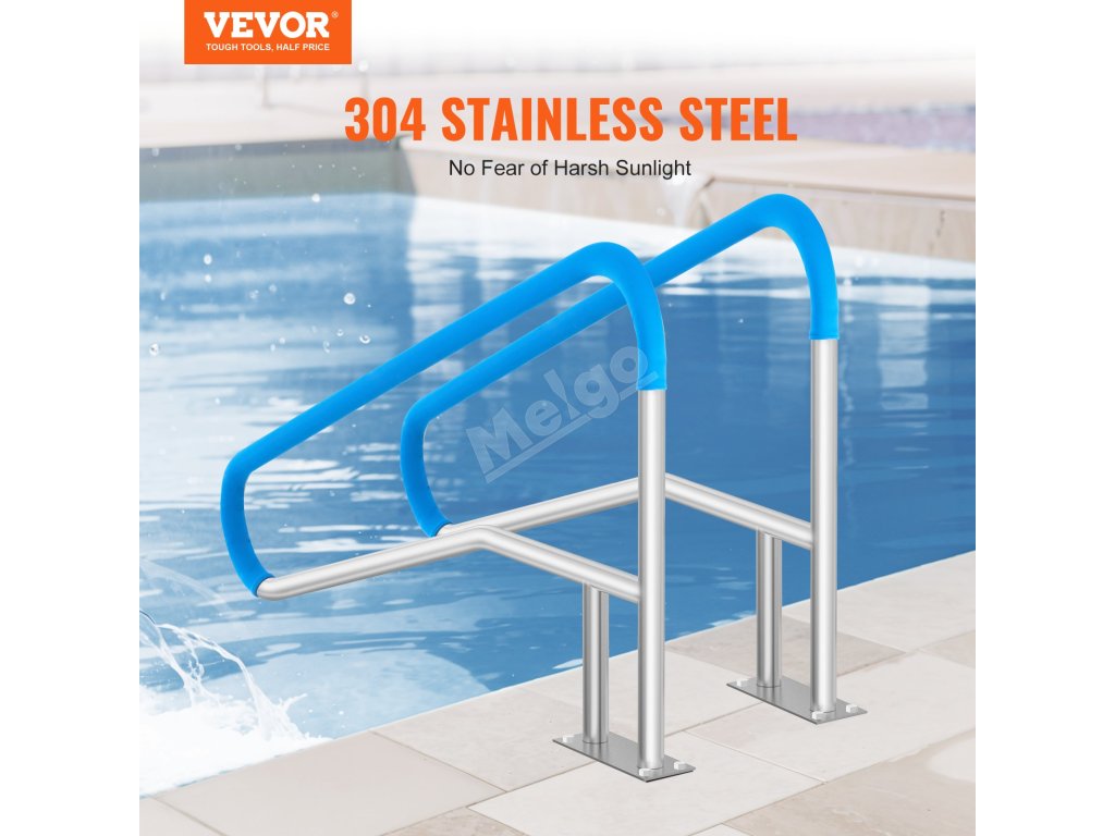 Zcela nové zábradlí z nerezové oceli, speciálně navržené pro bazény. Odolné proti nárazu a deformaci, opatřené protiskluzovými úchyty zábradlí pro bezpečnou oporu. Vyberte si naše výrobky zábradlí pro trvalou bezpečnost při nastupování.