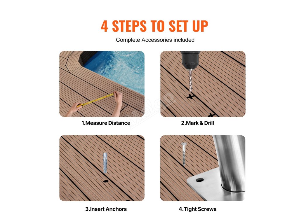 Naše bazénové zábradlí je kompatibilní s různými povrchovými materiály včetně betonu, dřeva a dlaždic, což umožňuje rychlou instalaci. K vytvoření bezpečného a pevného venkovního zábradlí není třeba žádné složité nářadí.